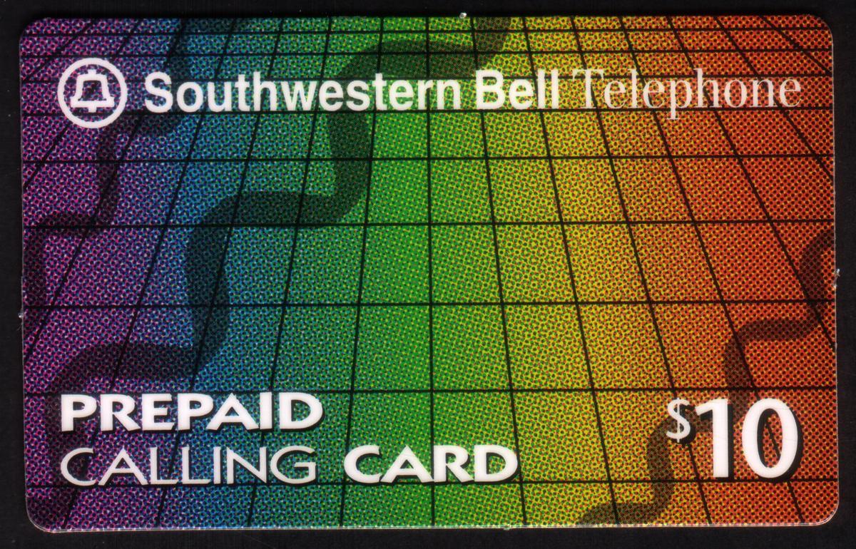 The card is issued by Southwestern Bell, as indicated by the company name clearly visible on the front. The denomination of the card is $10, which is printed clearly. The card blends colorful graphic elements with telecommunications imagery, presenting a modern, design-focused collectible related to phone services.