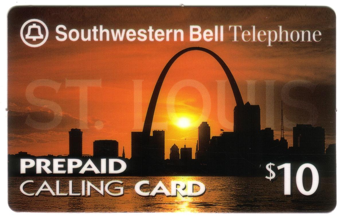 Text on the card includes “St. Louis, Missouri” and “Southwestern Bell,” indicating the issuer and geographical focus. The card’s value is marked as $10. The presence of the Arch alongside St. Louis’s skyline highlights this well-known travel destination and historical landmark, popular for sightseeing and tourism. The background features a soft blending of sunset colors and a calm water surface, enhancing the overall aesthetic appeal of the collectible.