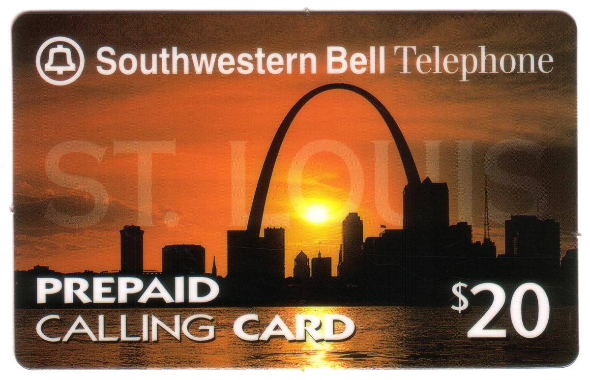 The card includes textual elements such as "St. Louis," "Missouri," along with “Arch & Skyline Across Water” prominently displayed. The Southwestern Bell logo appears on the card, indicating the telecommunications company associated with this collectible piece. The card’s value is marked as $20, situated clearly in one of the corners, reinforcing its function as a prepaid phone card.