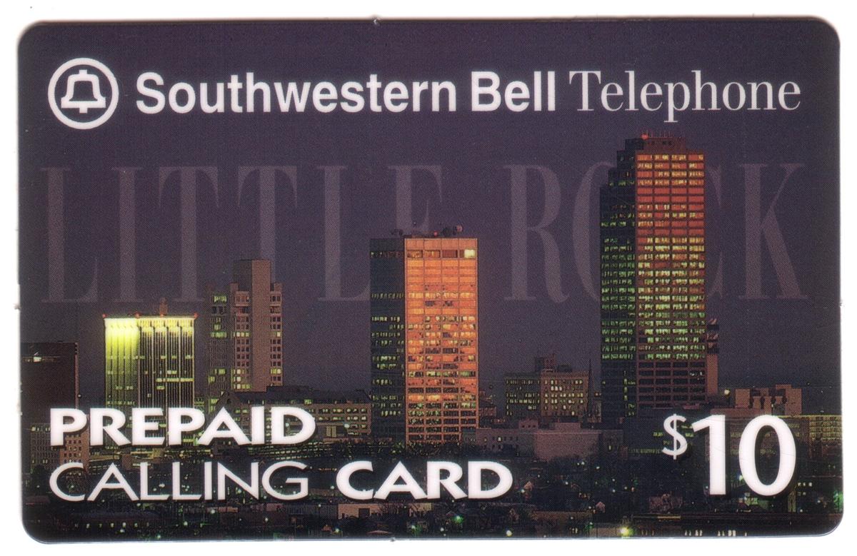 At the bottom left corner of the card, there is bold white text that reads "Little Rock Arkansas Skyline," identifying the city. Below this, the card displays "Southwestern Bell" in a smaller font, signifying the company associated with the card. The value of the card is printed as "$10" in white text located near the bottom right side. The design of the card centers on the theme of travel and urban landscapes, emphasizing Little Rock as a notable city in Arkansas.