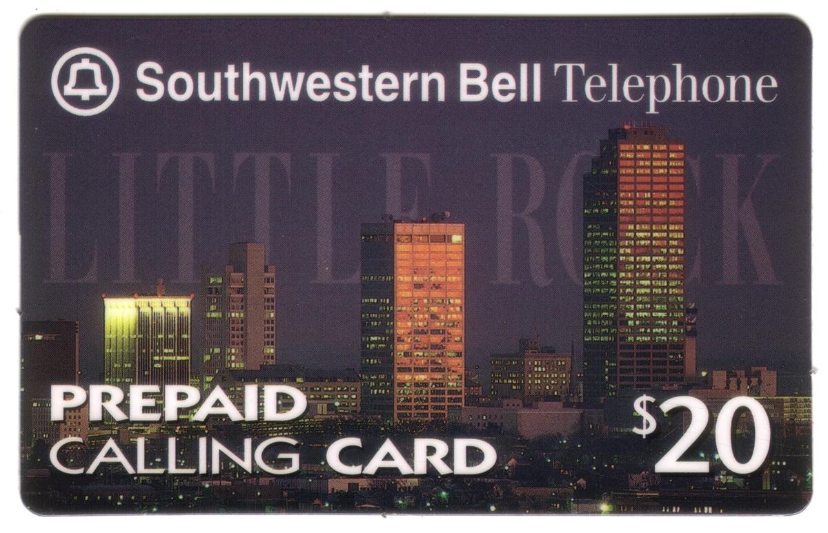 Text on the card reads "Little Rock, Arkansas Skyline" and "Southwestern Bell," identifying the location and the telecommunications company associated with the card. The card has a value of $20, indicated clearly, and includes the word "WorldCom" printed as a single word. This card is connected to travel themes and city skylines, representing Little Rock as a notable city in Arkansas.