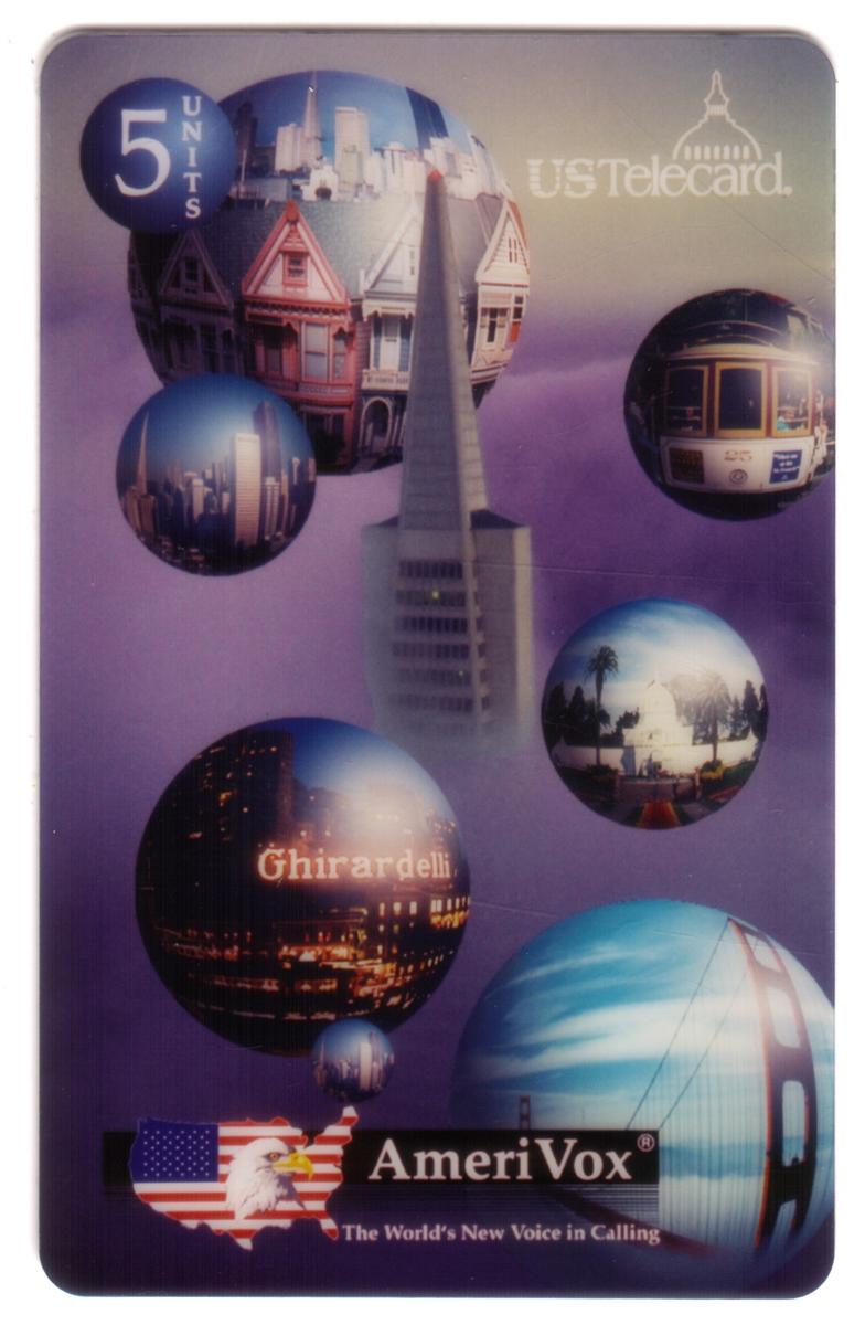 No other logos, brand names, or trademarks are present besides those mentioned. The card combines artistic imagery with practical telecommunication branding, capturing both the visual identity of San Francisco and the AmeriVox telecard service.