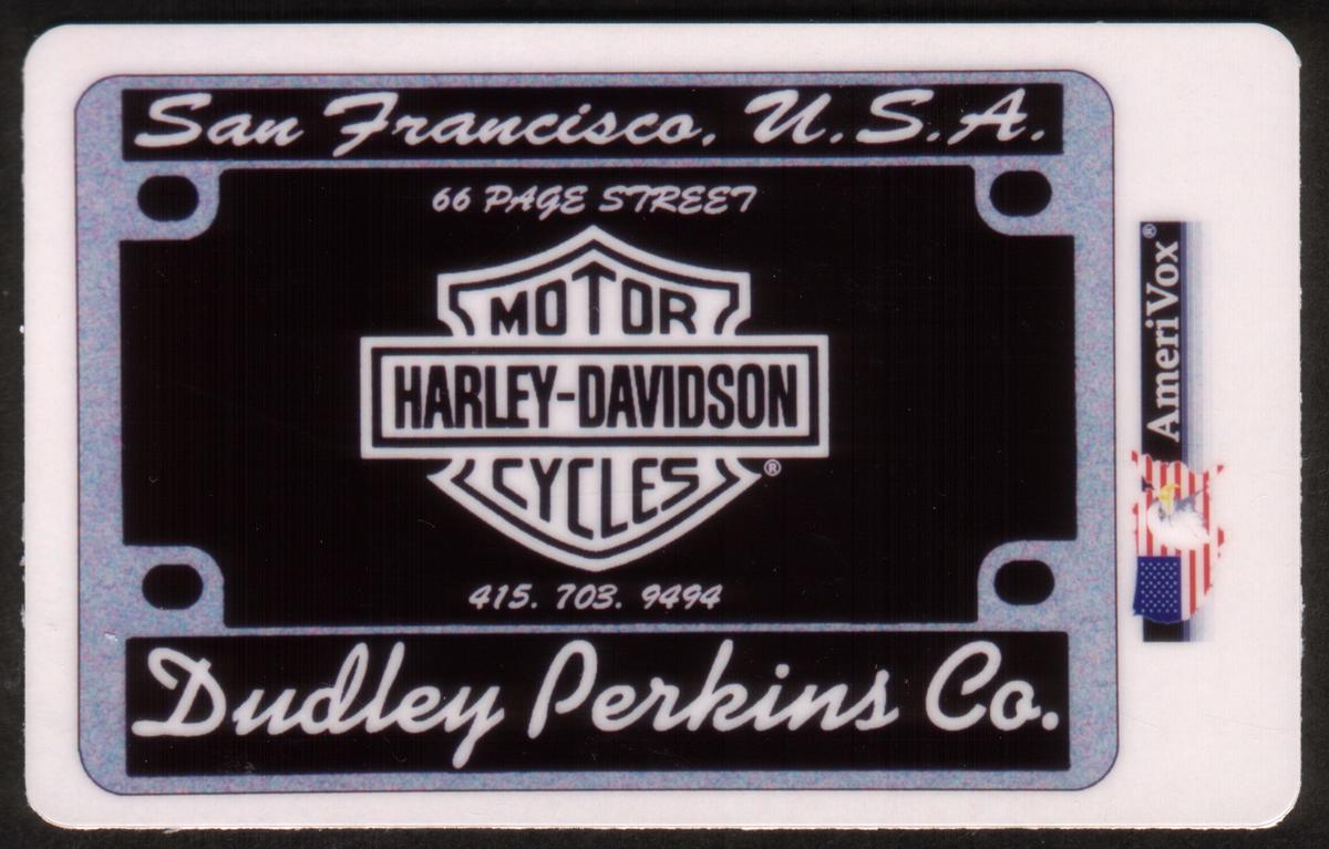 Harley-Davidson San Francisco license plate style card featuring Dudley Perkins Co., iconic logo, dealership info, and vintage motorcycle culture design. |