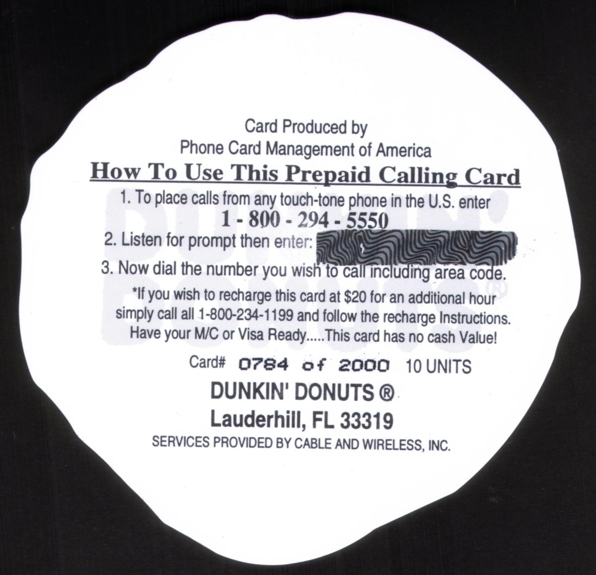 Keywords: Promotionals, advertisements, advertising, logos, trademarks, foods, sweets, bakeries, baked goods, donuts, donut shops, restaurants, pastries, diecut, Phone Card Management