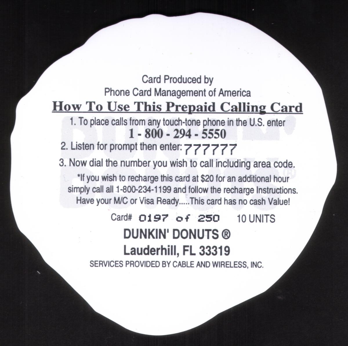Keywords: Promotionals, advertisements, advertising, logos, trademarks, foods, sweets, bakeries, baked goods, donuts, donut shops, restaurants, pastries, diecut, cwi, cable & wireless, c&w, Phone Card Management