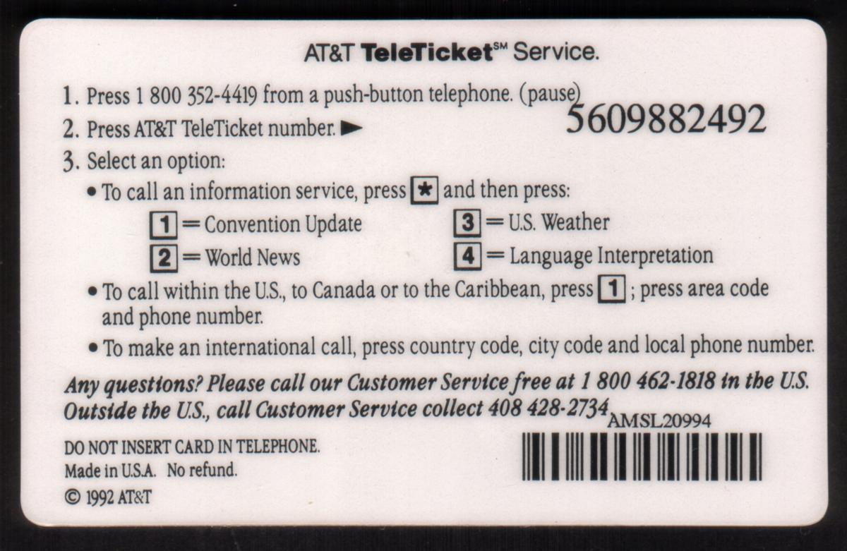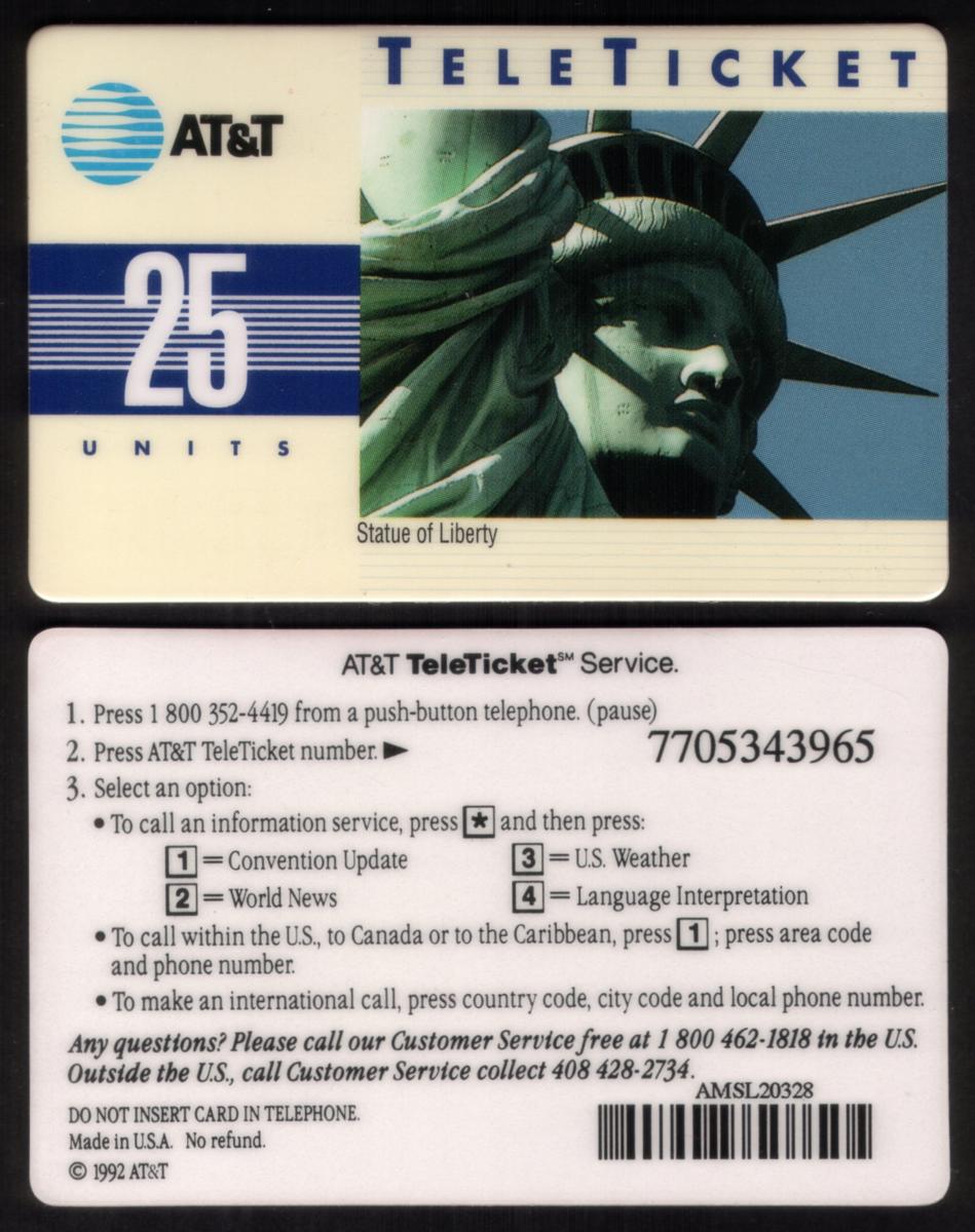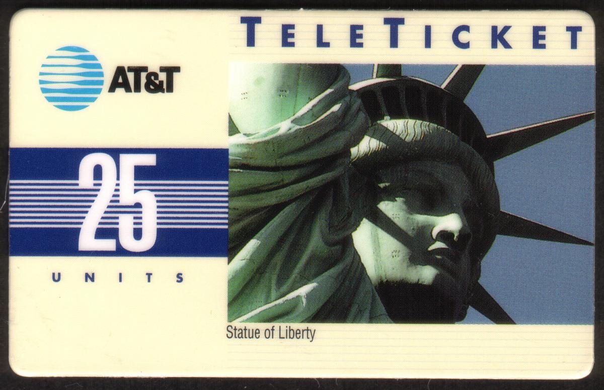 AT&T TeleTicket card from 1992 featuring the Statue of Liberty, 25 units value, with access to news, weather, and services, symbolizing Americana and telecom history. |