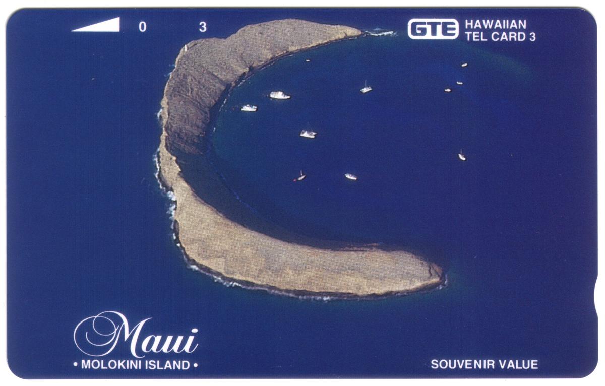 This collectible phone card features a scenic view of Molokini Island, located near Maui in the Hawaiian Islands. The image shows the crescent-shaped volcanic islet surrounded by clear blue ocean waters, with boats visible near the shore. The card emphasizes sightseeing and travel in Hawaii, highlighting the natural beauty of the region and its appeal as a destination for boating and tourism.