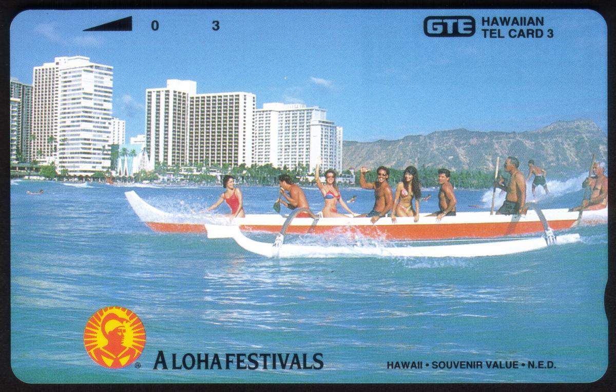 The phone card combines elements of sports, sightseeing, and hospitality, including references to hotels, making it a comprehensive tribute to Hawaiian tourism and leisure activities in the early 1990s. The imagery and text together create a vivid snapshot of Hawaii’s watersports and festival culture tied closely to travel and natural scenery.