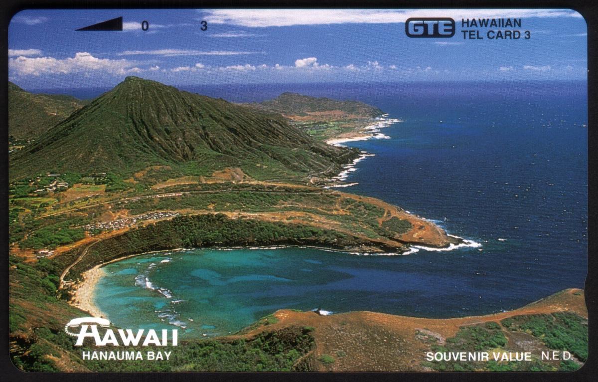 This collectible phone card features a detailed aerial photograph of the Hanauma Bay coastline located in Hawaii. The image captures the scenic beauty of the bay’s curving coastline, showcasing vibrant blue waters and lush green mountainous terrain surrounding the bay area. The photograph is taken from an elevated perspective, offering a broad view of the natural landscape including beaches and coastal formations along the shore.
