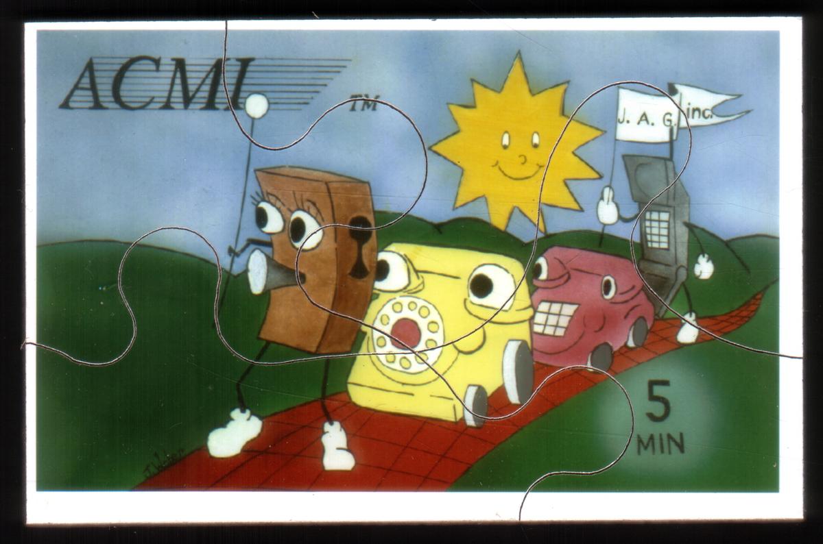 At the rear of the parade, there is a tall, gray mobile phone with a small screen and keypad; the phone character holds a white flag that reads "J.A.G Inc." The details include black wheels on the rotary phone and the car, giving the characters life and movement. The card also displays the denomination of "5 Min" for call time, clearly printed in black on the right side. The top left corner features the text "ACMI" with stylized horizontal lines, associating the artwork with the company.