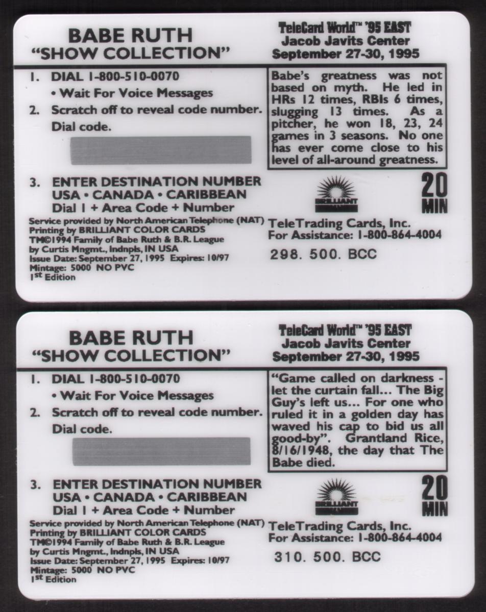 These two collectible phone cards feature iconic black and white photographic images of Babe Ruth, one of baseball's most legendary figures. Each card is marked with "20 MIN" in the top left corner and labeled "TeleTrading Card" in the top right, indicating their use and origin. Both cards belong to the "Babe Ruth Show Collection," as printed at the bottom in a classic serif font.