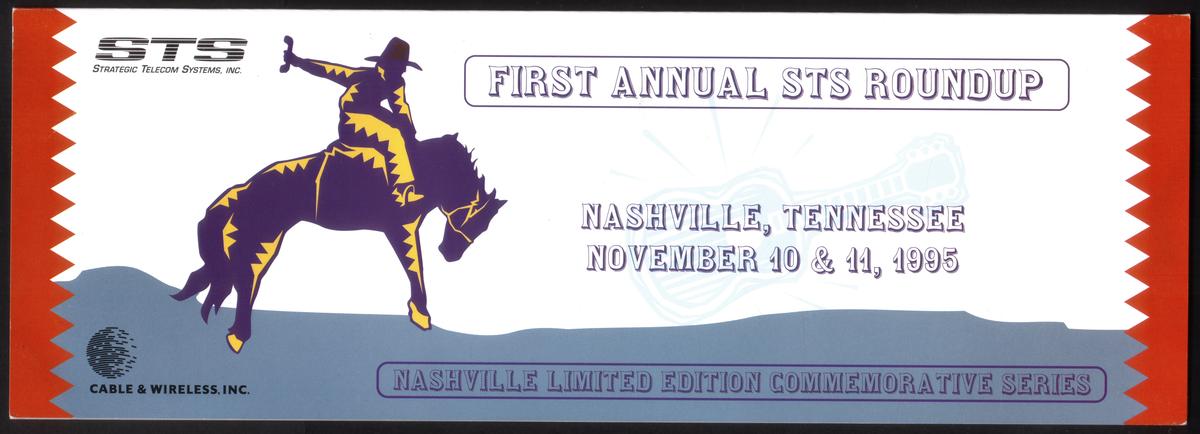 The card commemorates the “First Annual STS Roundup” held in 1995, specifically connected to the Cable & Wireless (CWI) STS 1st Conference in Nashville, Tennessee. Text on the card highlights this event, referring to the “Nashville Roundup 1995” and the “STS Roundup Puzzle Set of 3,” indicating it was part of a limited edition set issued for this occasion. The words “Strategic Telecom Sys.” appear, indicating the organizing entity linked to the conference and collectible set.