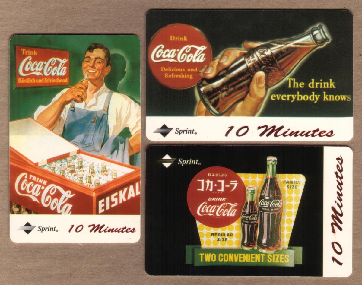 All three cards are part of a Coca-Cola memorabilia collection, showcasing Coca-Cola logos and advertisements from Japan, Germany, and the United States. The use of multiple languages and iconic imagery highlights the global appeal of Coca-Cola.