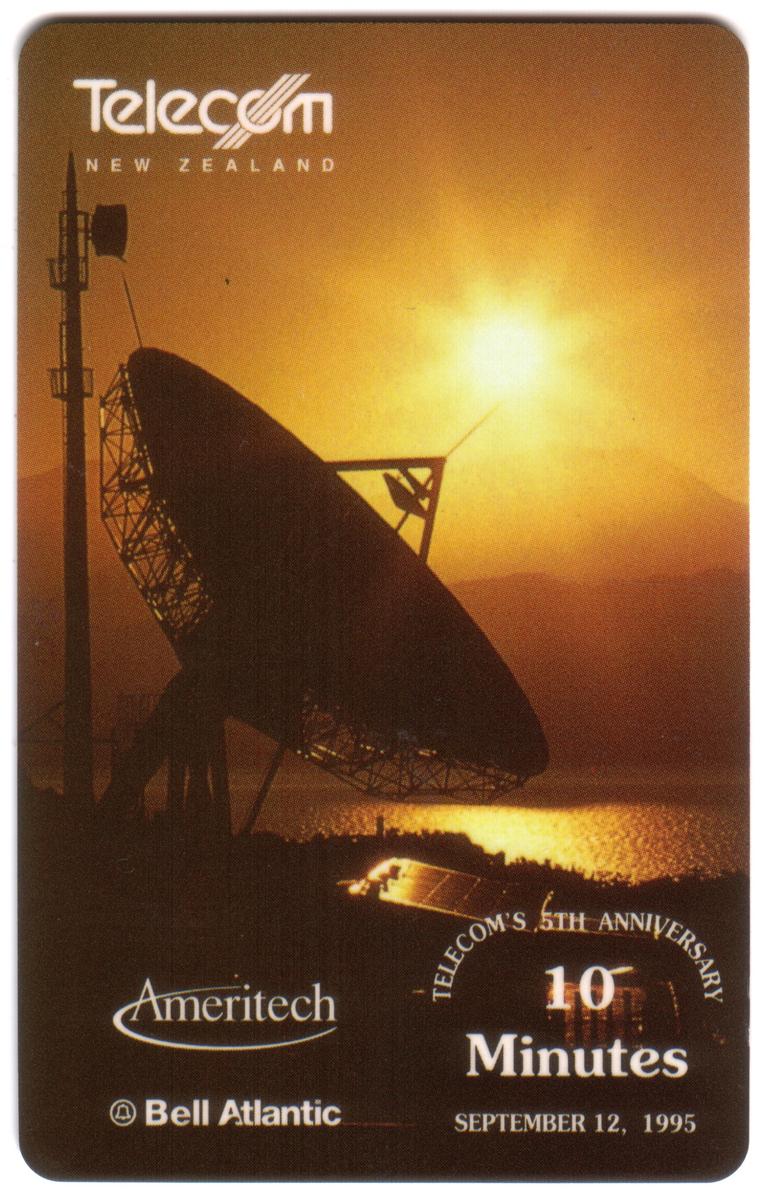 In the lower area of the card, the Telecom New Zealand logo is clearly displayed, accompanied by text reading "5th Ann. Satellite (1995)." The card also includes the Bell Atlantic logo and the Ameritech name, referencing notable telecommunications companies. The overall design underscores the milestone in satellite receiver technology and the partnership within the telecom industry during that period.