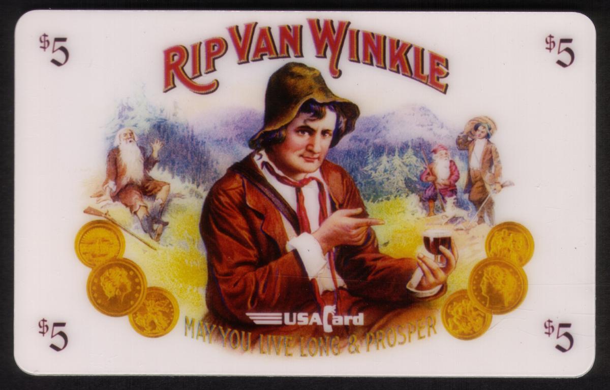 This card is issued by USACard Corporation and carries a $5 denomination. The overall imagery emphasizes hunting and rustic leisure, blending traditional iconography with a nostalgic representation of Rip Van Winkle in a natural, serene setting.
