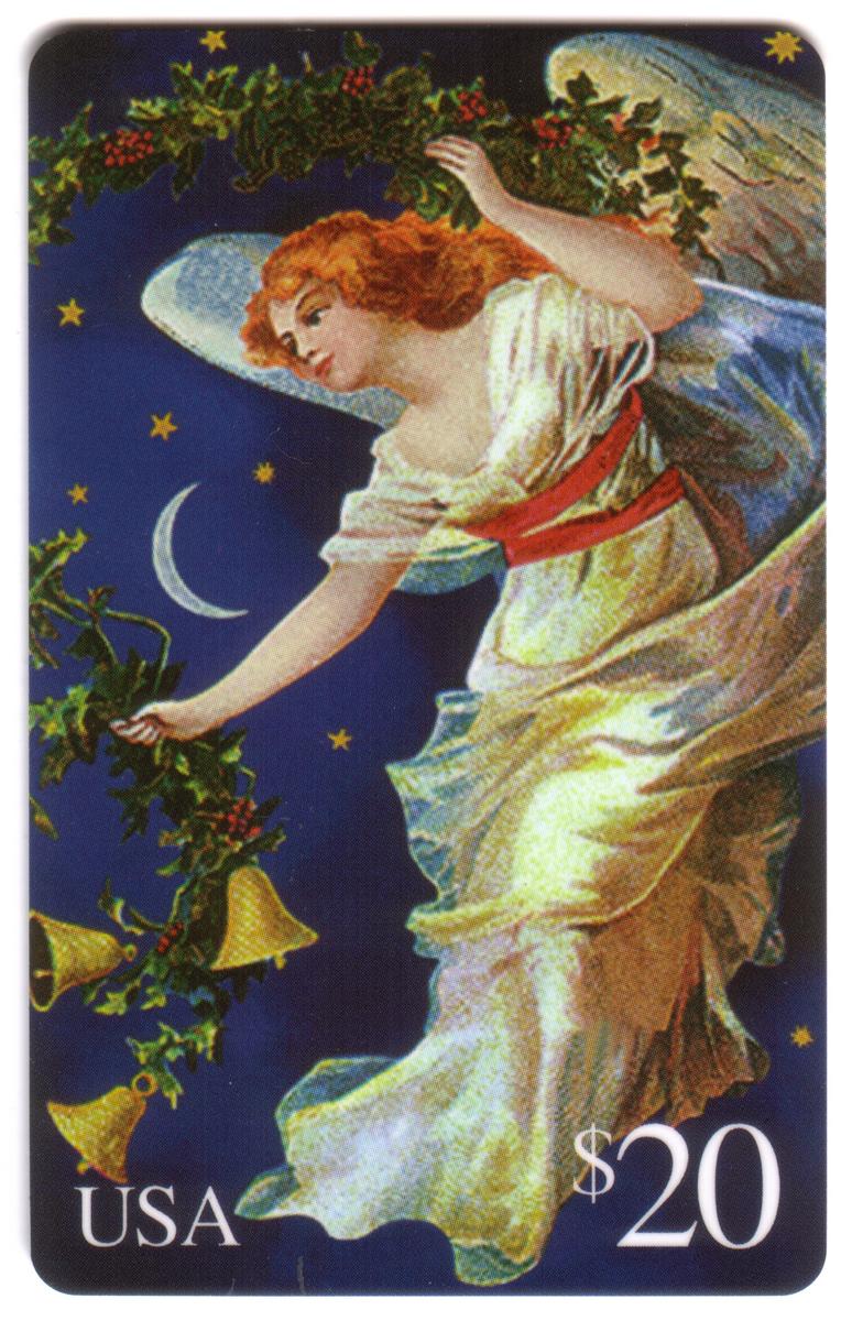 This card is identified as the "Midnight Angel," part of the 1995 U.S. Postal Service Christmas Trial series. It is issued by USPS in collaboration with Amex Telecom, emphasizing its use as a first-class phone card for $20. The imagery and design evoke the Christmas holiday spirit with traditional symbols such as angels, bells, holly, moon, and stars.
