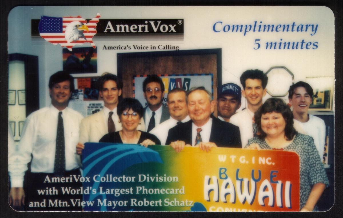 This collectible phone card from AmeriVox features a group of nine people standing together and holding a large Blue Hawaii phone card. The image includes AmeriVox Collector Division members alongside Mountain View Mayor Robert Schatz, who is positioned near the center of the group. The individuals are dressed in business and casual attire, and the photo is taken indoors with office surroundings, including shelves and framed items in the background.