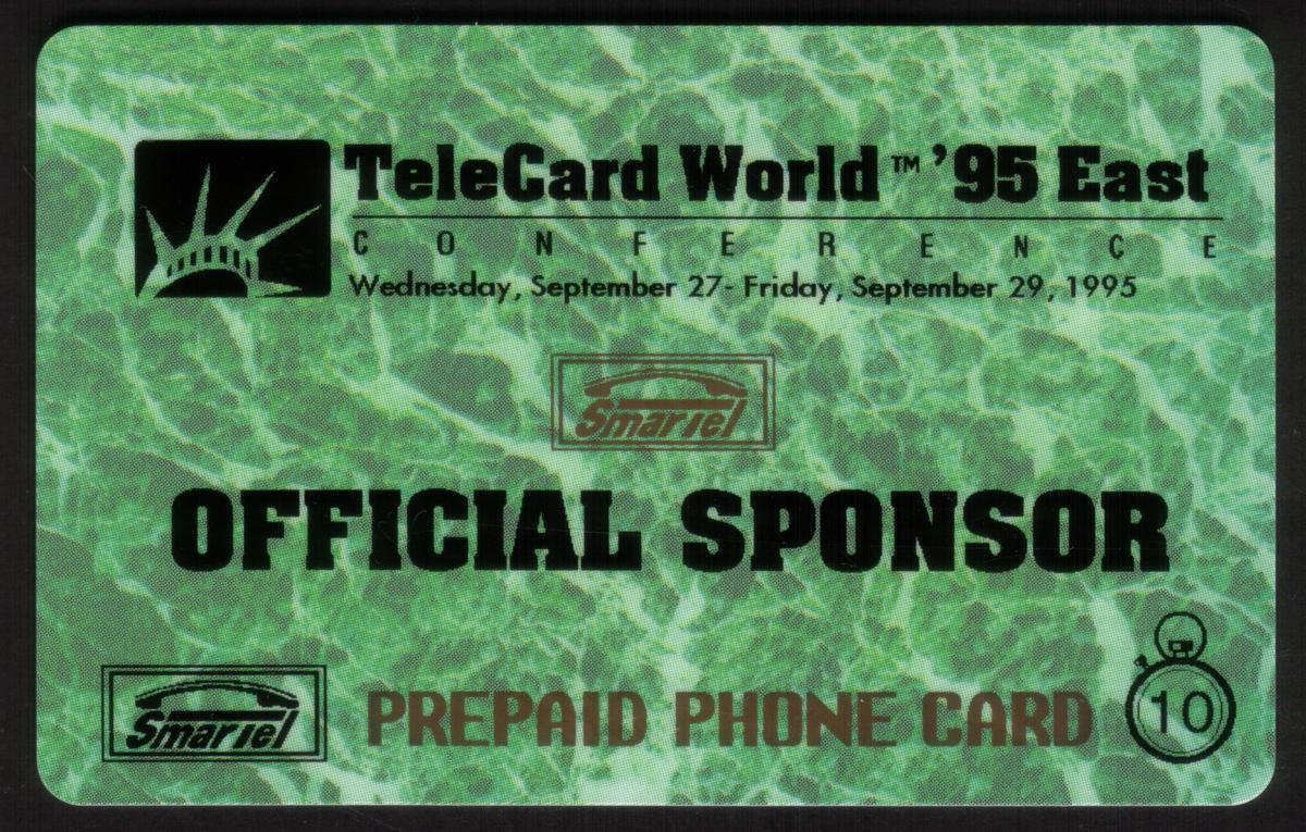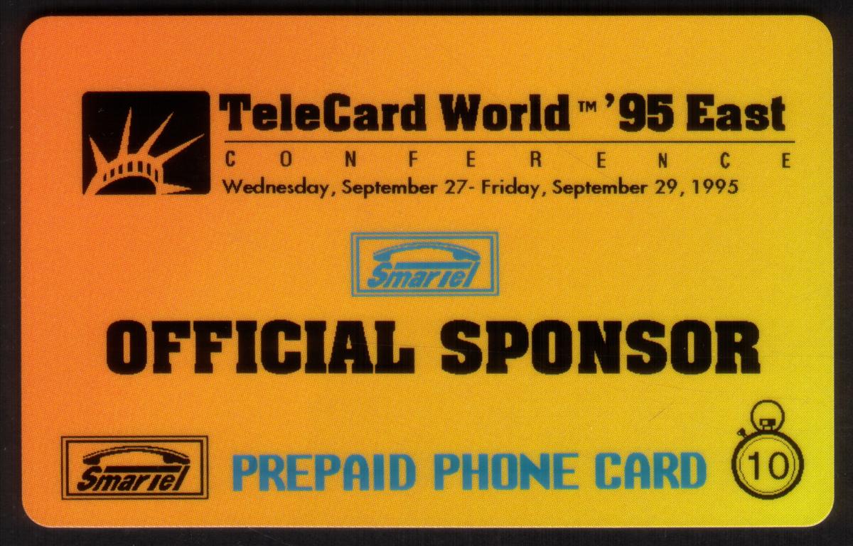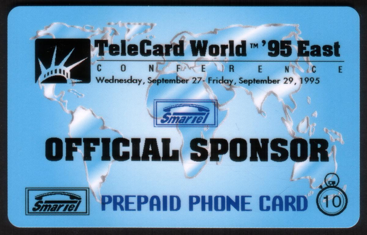 The cards bear inscriptions indicating their 10 million unit value and "Official Sponsor" status. The set commemorates the TeleCard Events and expos associated with TeleCard World 95 East, reflecting the significance of global telecommunications developments during that period. The presence of branding from SmarTel Communication verifies the issuing entity’s role in the event.
