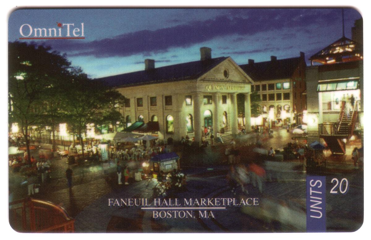The lower portion of the card displays the text “Faneuil Hall Marketplace Photo (Boston)” along with the company name OmniTel, identifying the card issuer. This card is part of a sightseeing and travel series showcasing tourist attractions. The overall presentation highlights Boston’s landmark marketplace as an iconic center for shopping and tourism.