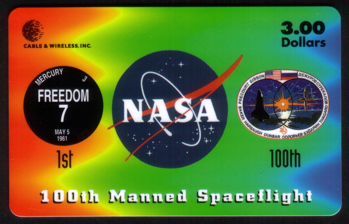 This collectible phone card commemorates the 100th manned spaceflight and features elements related to space exploration and NASA’s space programs. The card prominently displays the authentic NASA "meatball" insignia, symbolizing the United States space agency. It pays tribute to significant astronauts including Gibson, Precourt, Baker, Harbaugh, and Dunbar, whose names are printed on the card. The card also references Mercury 3 and Freedom 7, historic missions in early spaceflight history.