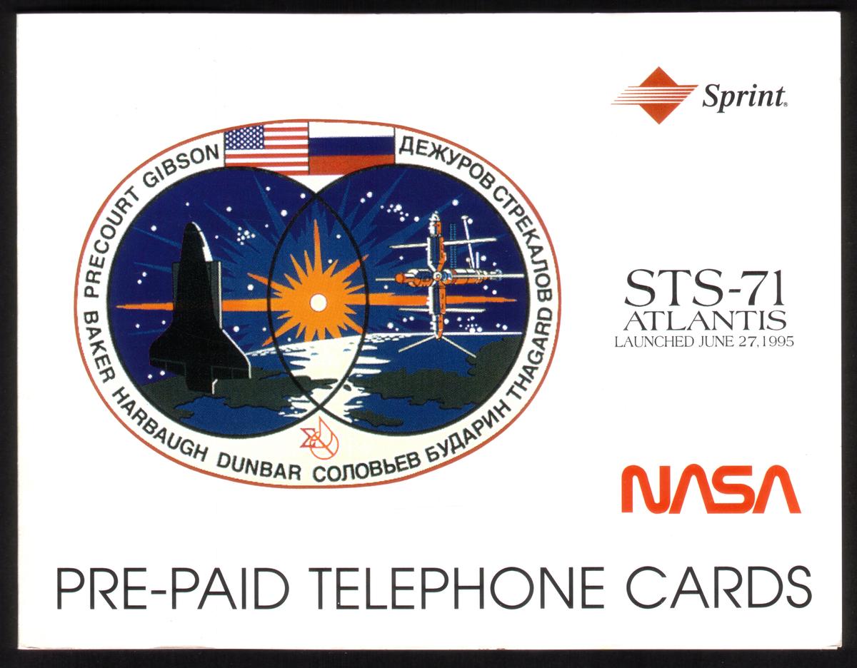 Together, these cards form a two-card puzzle set celebrating the STS-71 mission, the first shuttle docking with Mir, a milestone in international space cooperation between NASA and Russia. The detailed imagery, mission dates, and national symbols underline the historic spaceflight event in 1995.