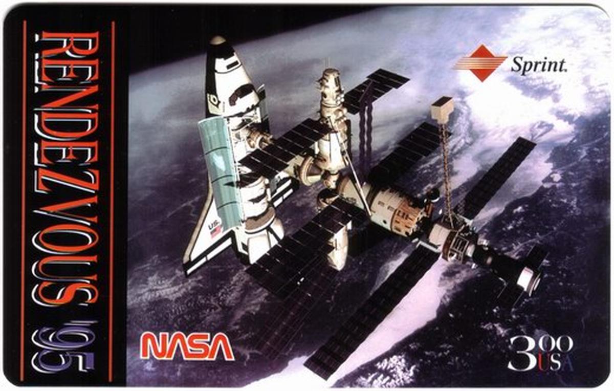 This collectible phone card highlights the 1995 NASA space mission STS-71 Atlantis, focusing on the historic first docking between the Space Shuttle Atlantis and the Russian space station Mir. The front of the card features a detailed image of the shuttle Atlantis in orbit, set against the backdrop of outer space and the Earth’s curvature. The design incorporates the text "NASA Rendezvous '95: First Docking Atlantis & Mir" along with the mission name "STS-71 Atlantis" and a "$3" denomination. The Earth is visible as a glowing globe beneath the spacecraft, emphasizing the theme of international space cooperation and scientific research.