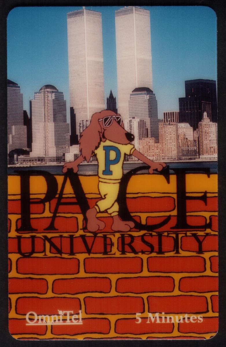 Vibrant Pace University phone card featuring Manhattan skyline with Twin Towers, a playful mascot, brick wall design, and 5-minute call details. |