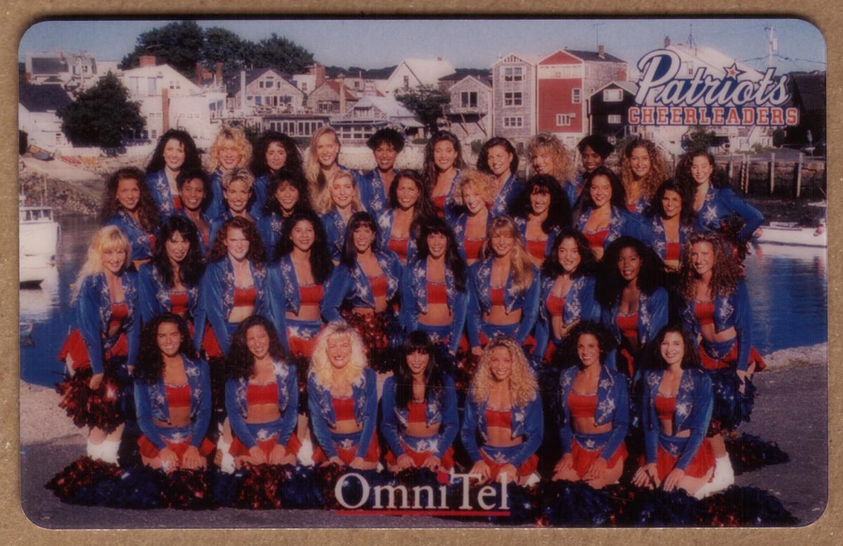 The card is marked with the label "OmniTel" in the upper right corner, indicating the provider or issuer of the card. Text on the card states "15m New England Patriots Cheerleaders (Team Photo)," indicating its value or designation. The overall design reflects a sports promotional theme tied to American football and cheerleading associated with the New England Patriots.