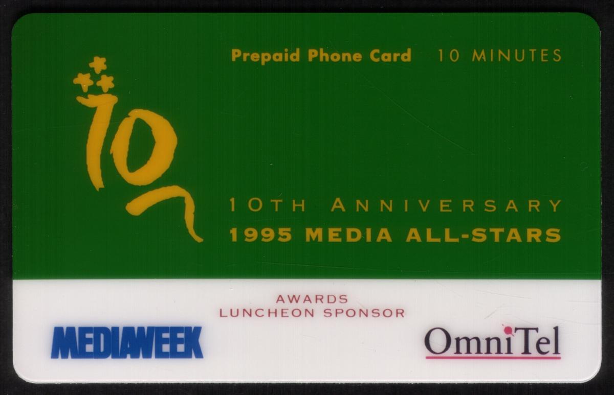 This collectible phone card commemorates the 10th Anniversary of Media All-Stars as featured by Mediaweek Magazine. The design prominently displays the "10m 10th Anniv. Media All-Stars" logo along with "Mediaweek Magazine" in clear, bold letters. The card showcases several key trademarks and logos associated with Mediaweek and the anniversary celebration. The overall layout uses a sleek and professional color scheme to reflect the media industry theme.