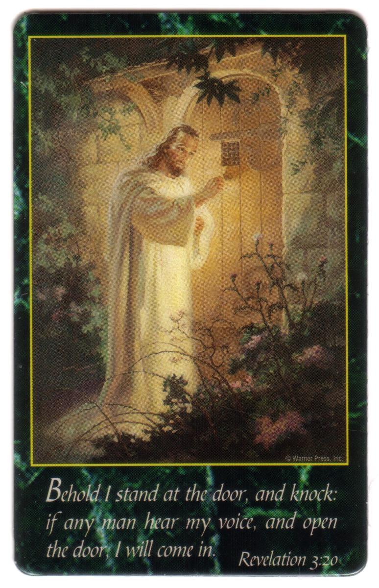 The first card shows Jesus Christ standing and knocking at a wooden door surrounded by foliage, with the scripture Revelation 3:20 that reads: "Behold I stand at the door, and knock: if any man hear my voice, and open the door I will come in." The second card presents a young man steering a ship’s helm with Jesus standing behind him, pointing forward, accompanied by the Bible verse Psalm 25:5 (NIV): "Guide me in your truth and teach me; my hope is in you all day long." The third card displays a classical portrait of Jesus Christ looking slightly upward, along with Hebrews 13:8: "Jesus Christ: the same yesterday, and today, and forever."