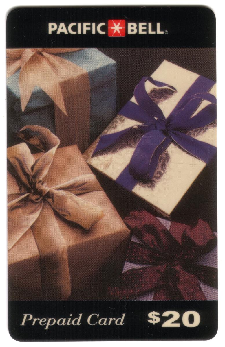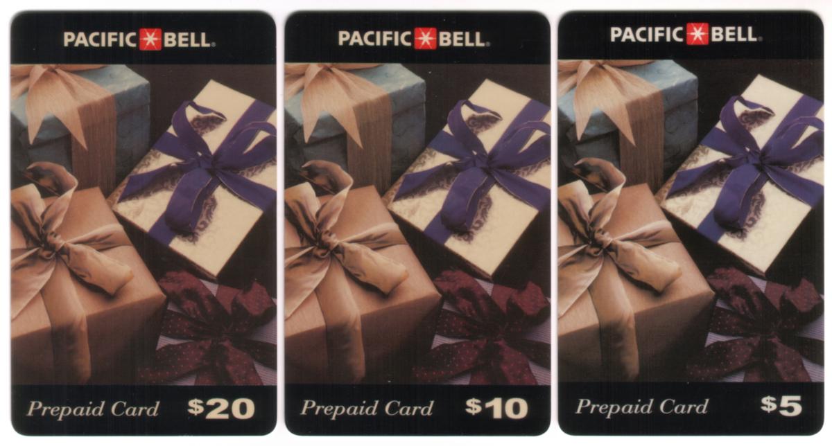 These Pacific Bell prepaid cards each feature a photographic image of four wrapped Christmas presents against a dark background. The gifts are adorned with large, elegant bows in varied colors and textures, including gold, purple, and maroon. The bows have prominent, neatly tied loops and tails, adding a festive holiday touch. The gifts are arranged to fill the card’s front surface, showcasing the holiday theme of Christmas gifts and decorations.