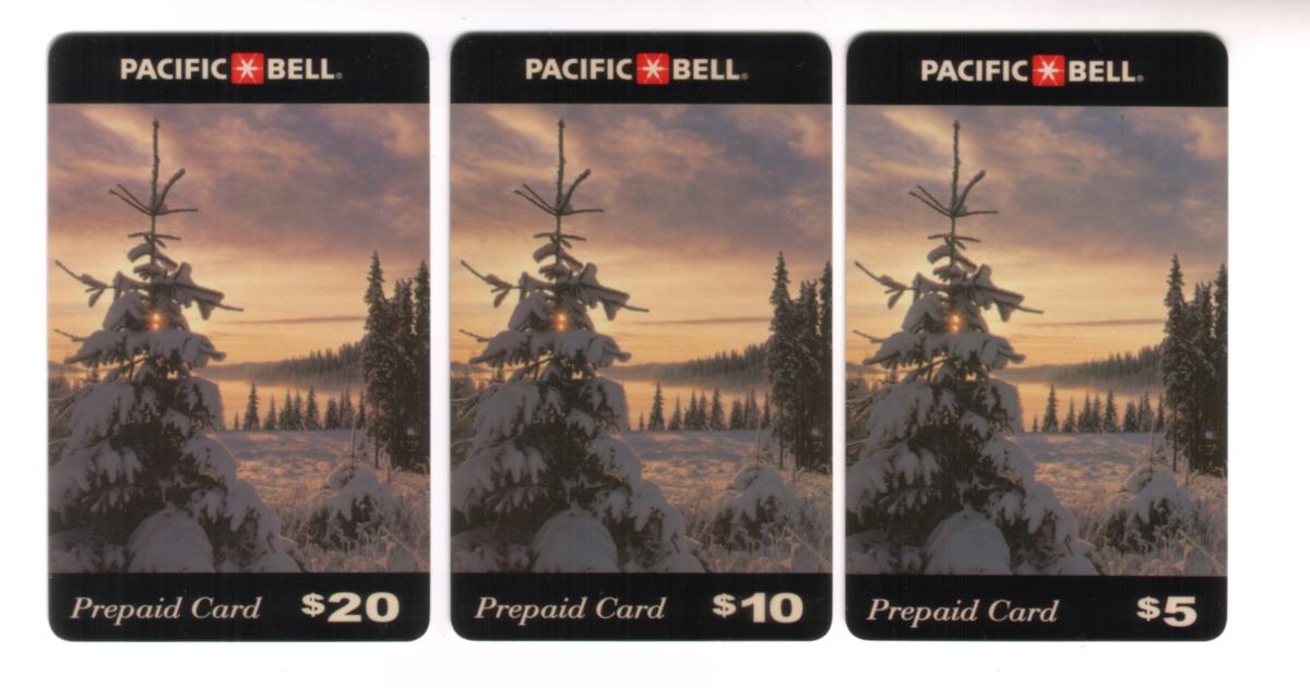 Each card is labeled at the top with the "PACIFIC BELL" logo, which includes a white star within a red square between the words "PACIFIC" and "BELL." The bottom portion of each card shows the text "Prepaid Card" in white script on a black background, along with the card’s value located in the bottom right corner. The values for the set are $5, $10, and $20, respectively.