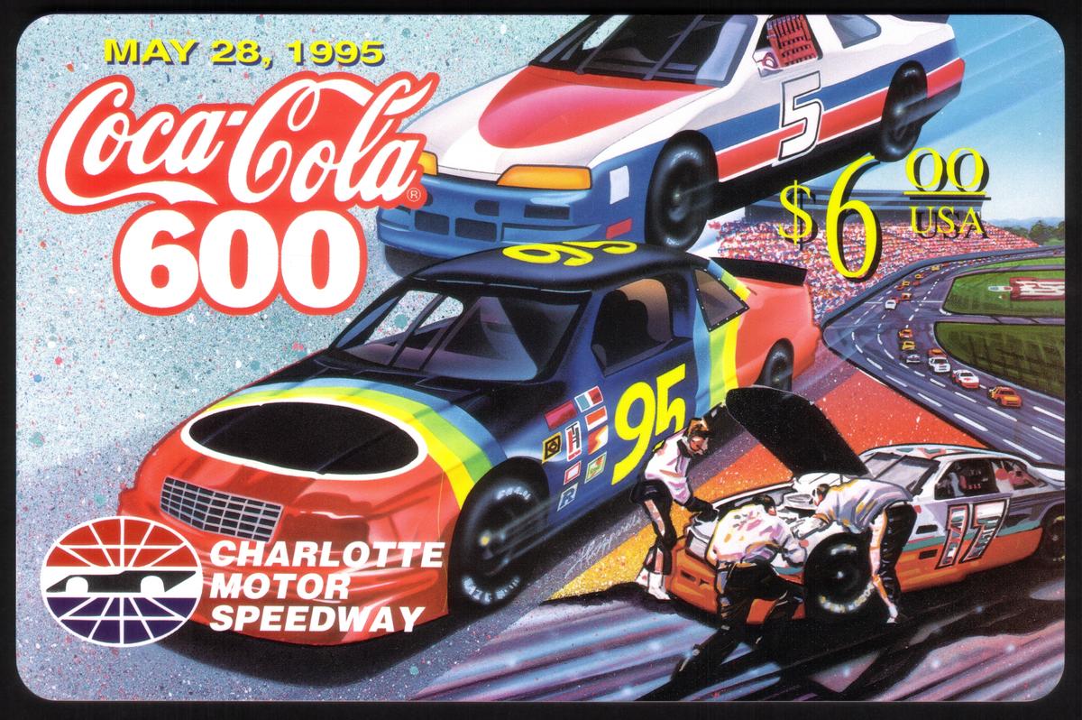 Vivid 1995 Coca-Cola 600 NASCAR race scene with race cars, pit crew, Charlotte Speedway logo, and $6.00 denomination, capturing motorsport history and culture. |
