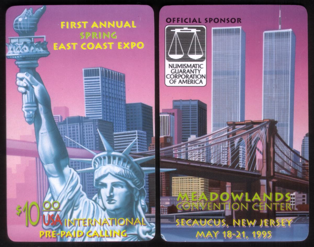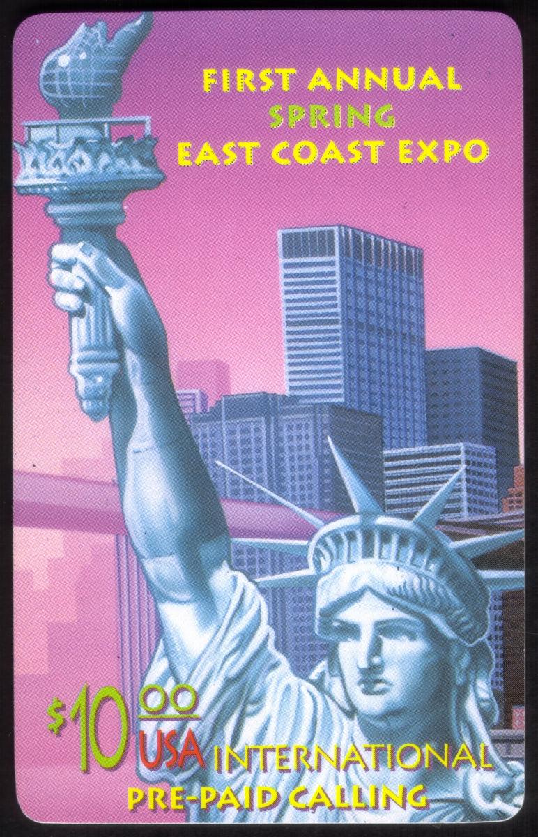 This collectible phone card celebrates the First Annual Spring East Coast Expo held at the Meadowlands Convention Center in Secaucus, New Jersey, from May 18 to 21, 1995. The front of the card prominently features the Statue of Liberty set against a stylized cityscape with skyscrapers under a pink-purple sky. Text on the front includes “FIRST ANNUAL SPRING EAST COAST EXPO,” the prepaid calling value of "$10.00 USA INTERNATIONAL PRE-PAID CALLING," and highlights the American icon on the design.