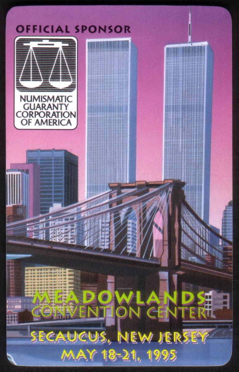 The reverse side of the card showcases a detailed image of the Brooklyn Bridge with the Twin Towers of the World Trade Center visible in the background. The card identifies the "NUMISMATIC GUARANTY CORPORATION OF AMERICA" as the official sponsor of the event, with their logo displayed above the cityscape. Additional text on this side reads “MEADOWLANDS CONVENTION CENTER SECAUCUS, NEW JERSEY MAY 18-21, 1995,” emphasizing the location and date of the expo.