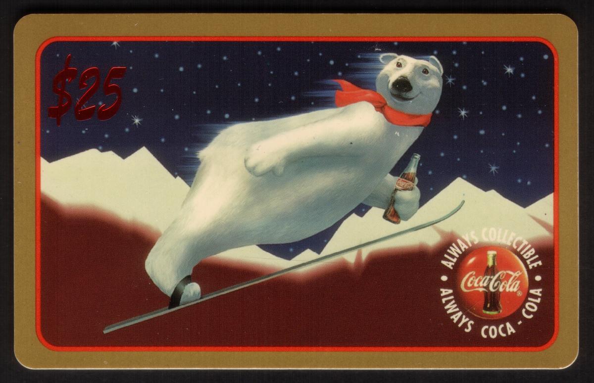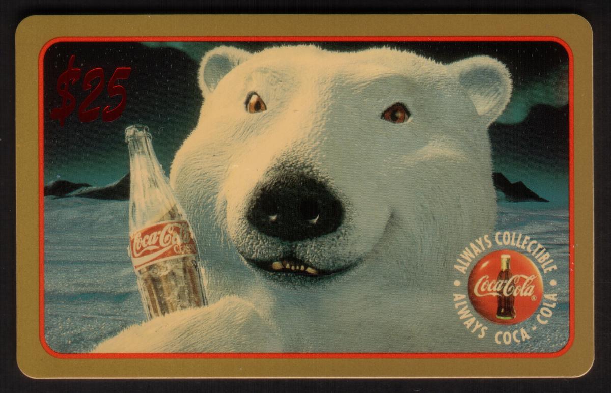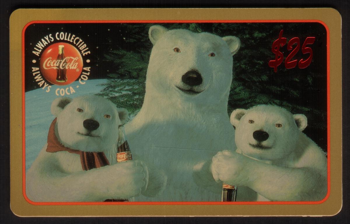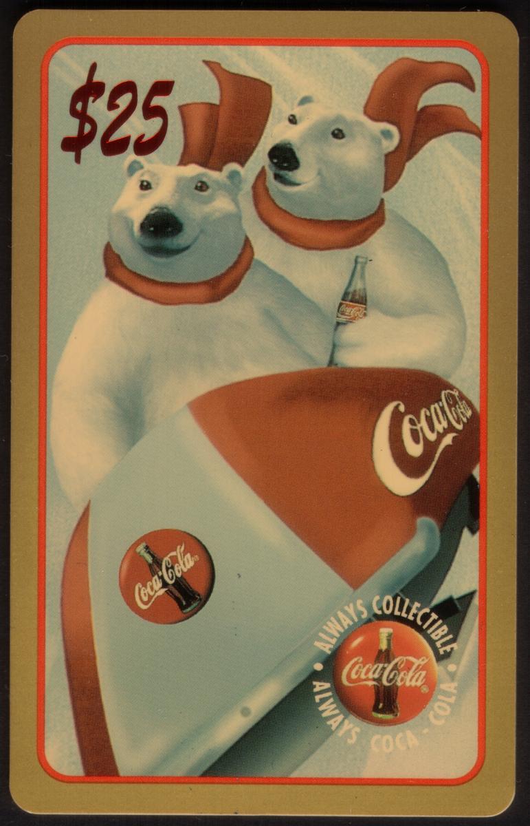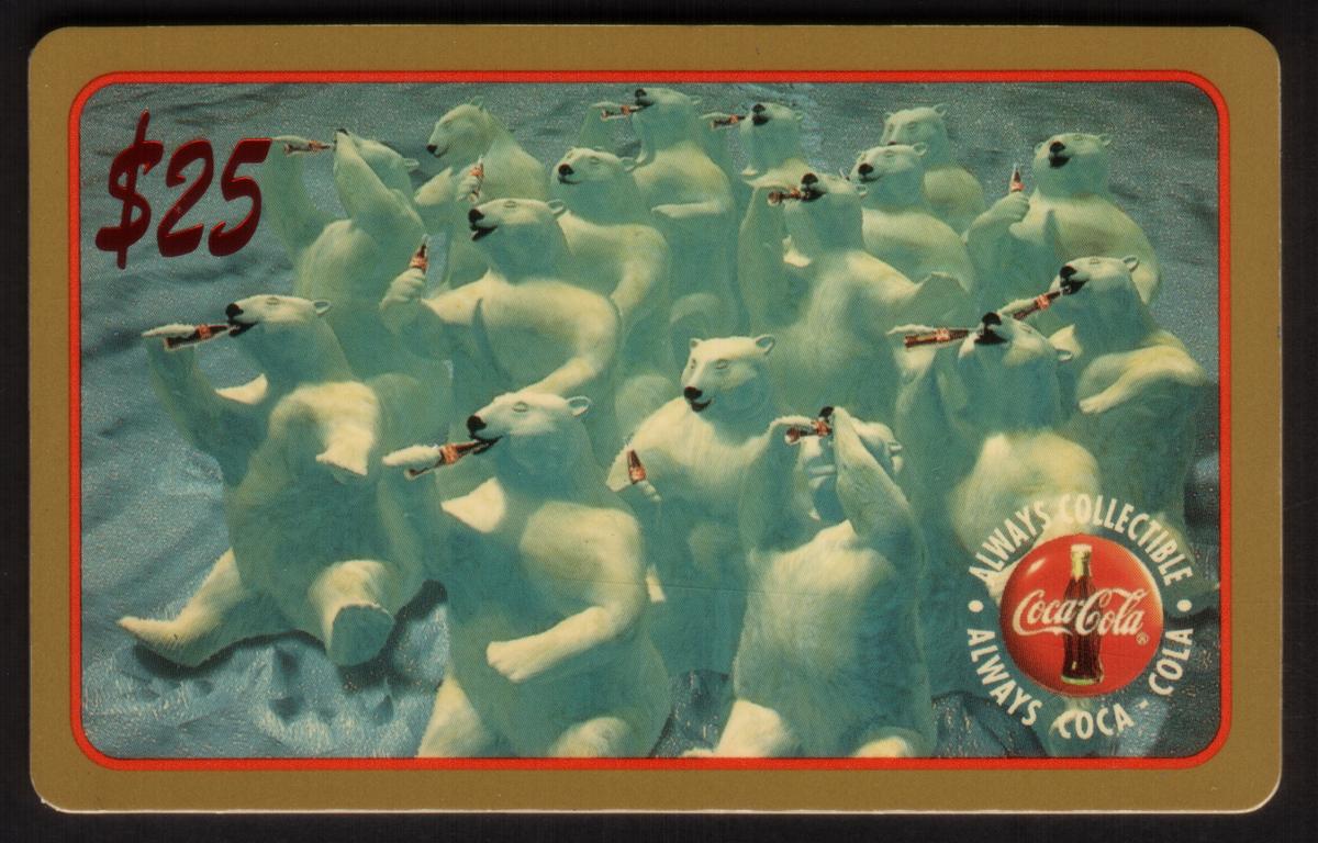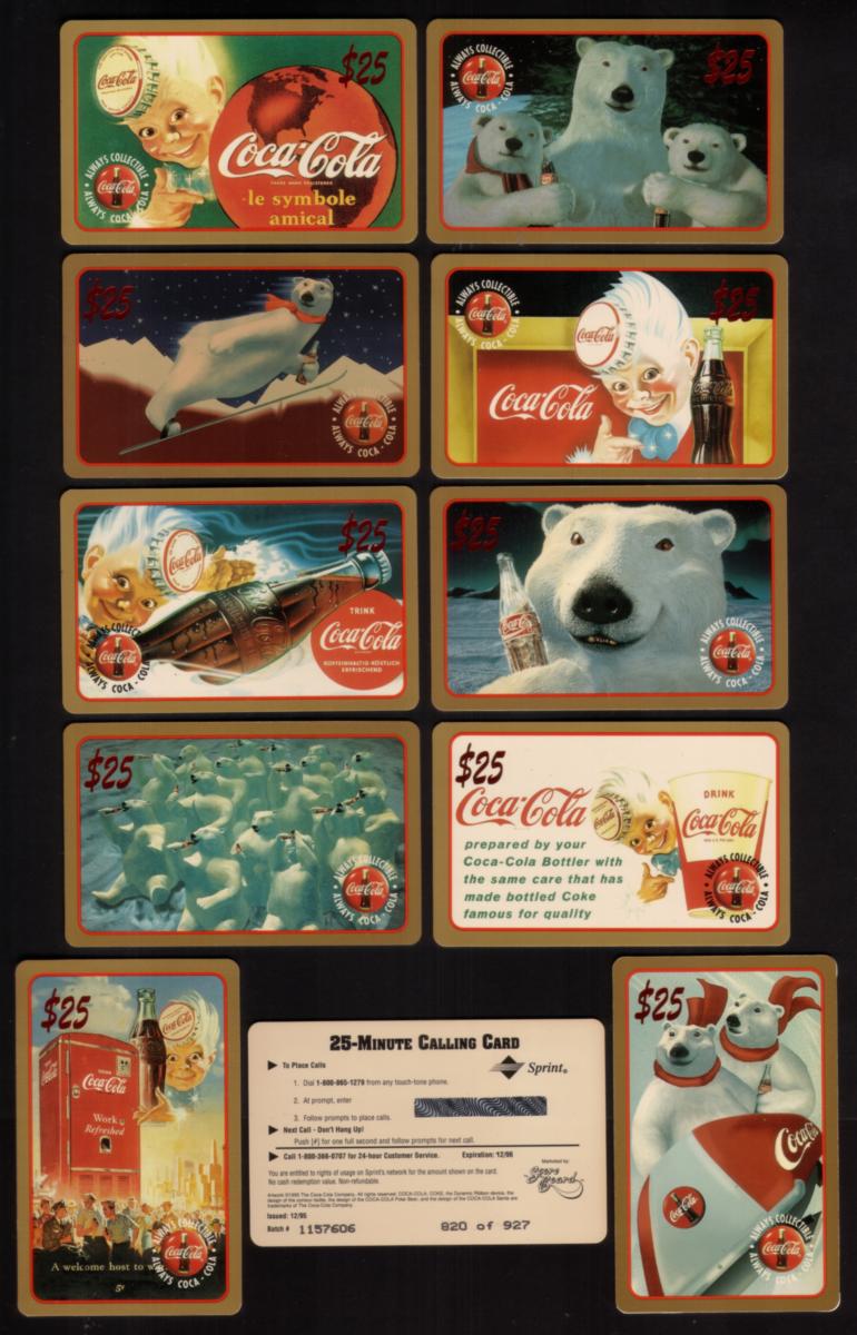 This is a complete set of 10 different collectible Coca-Cola phone cards, each valued at $25. The cards showcase a variety of Coca-Cola themed artwork featuring the iconic polar bears and vintage Coca-Cola imagery. The cards incorporate the Coca-Cola logo prominently and display the phrase "ALWAYS COLLECTIBLE ALWAYS COCA-COLA" in a circular emblem with a red Coca-Cola bottle cap design.