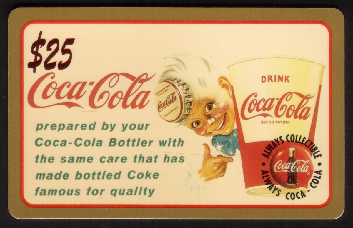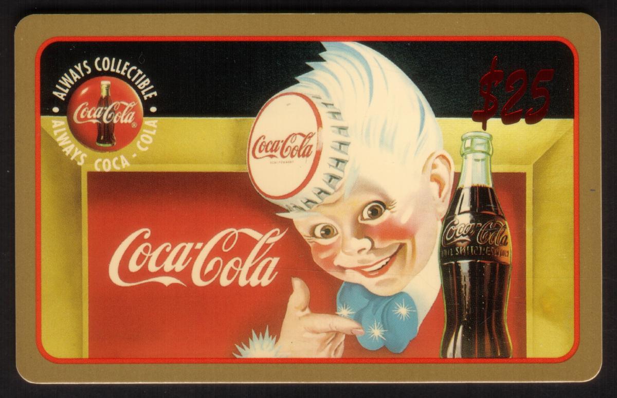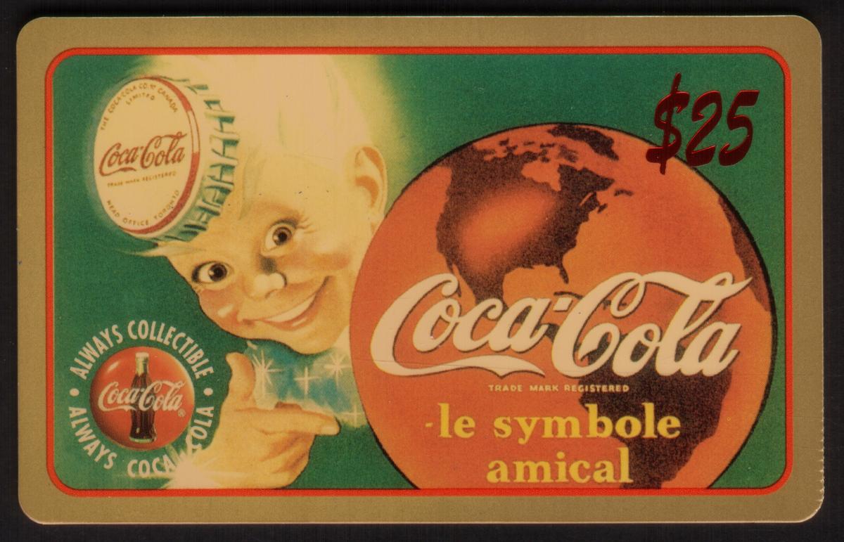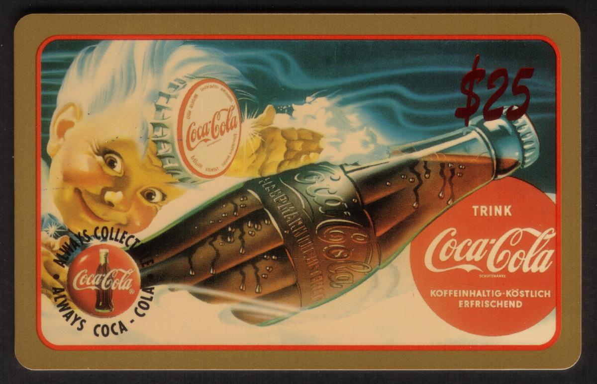 Other cards incorporate nostalgic Coca-Cola advertising themes with a vintage style. One depicts a classic soda vending machine with a crowd gathering below and the phrase “Work Refreshed”; others feature a smiling boy with a Coca-Cola bottle cap hat alongside a bottle of Coke and vintage Coca-Cola text in English and French such as “le symbole amical.” Another card shows a stylized Coca-Cola bottle with a red circle bearing German text: “koffeinhaltig - köstlich - erfrischend.” All cards share the common design elements of the $25 denomination, Coca-Cola logos, and collectible branding for this 1995 set issued by The Score Board Inc.