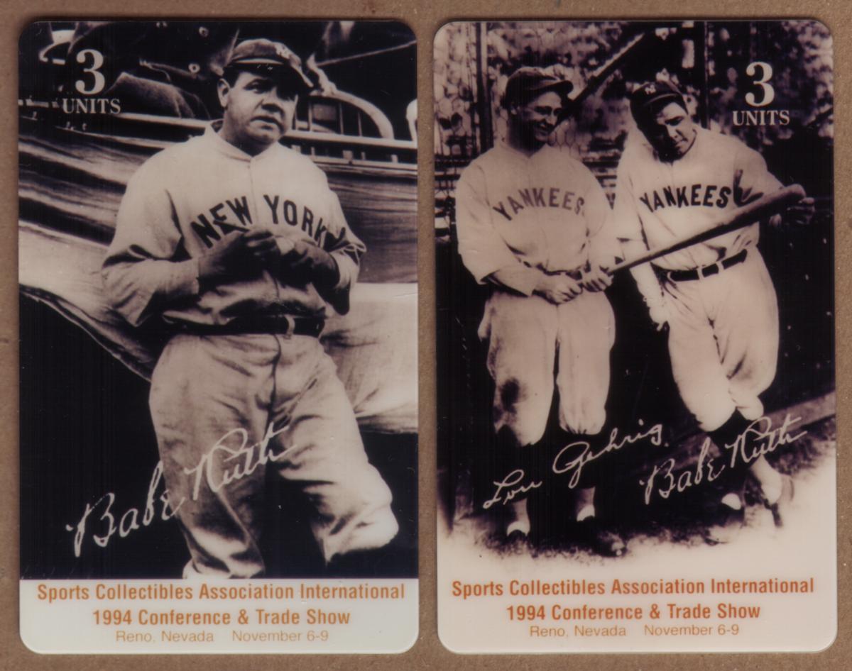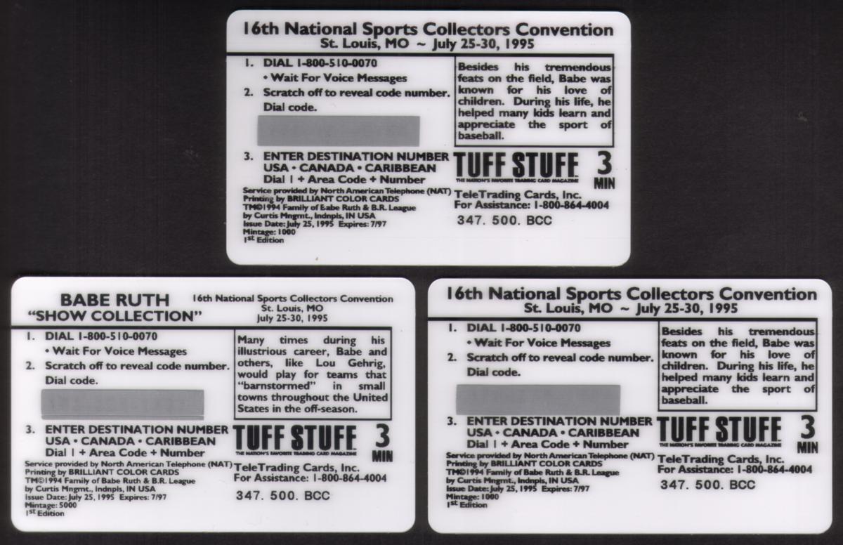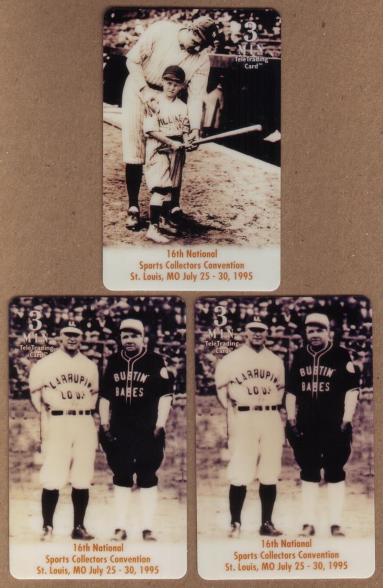 The cards commemorate various sports memorabilia conventions and expos held across the United States between 1994 and 1995. Notable events include the Sports Collectibles Association International 1994 Conference & Trade Show in Reno, Nevada (November 6-9), TeleCard World ’95 West at the Los Angeles Convention Center (March 1-5, 1995), the American Tele-Card Expo in San Antonio, Texas (June 1-3, 1995), the 16th National Sports Collectors Convention in St. Louis, Missouri (July 25-30, 1995), the International Sportscard & Memorabilia Expo in Anaheim, California (September 1-4, 1995), and TeleCard World ’95 East at the Jacob Javits Center (September 27-30, 1995).