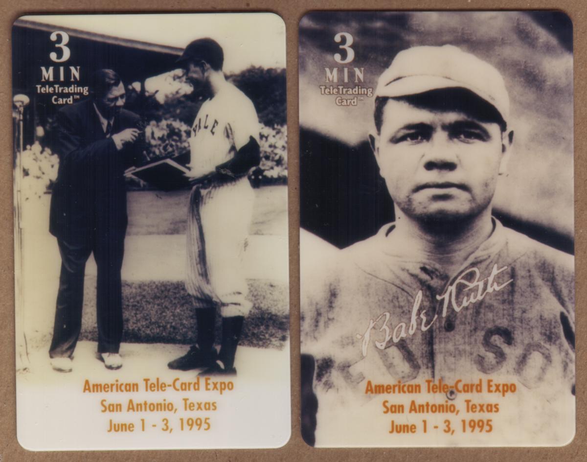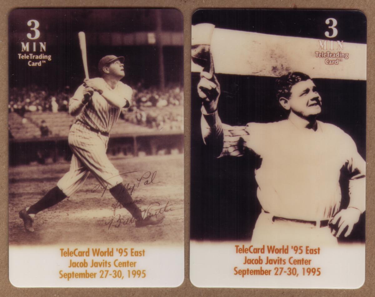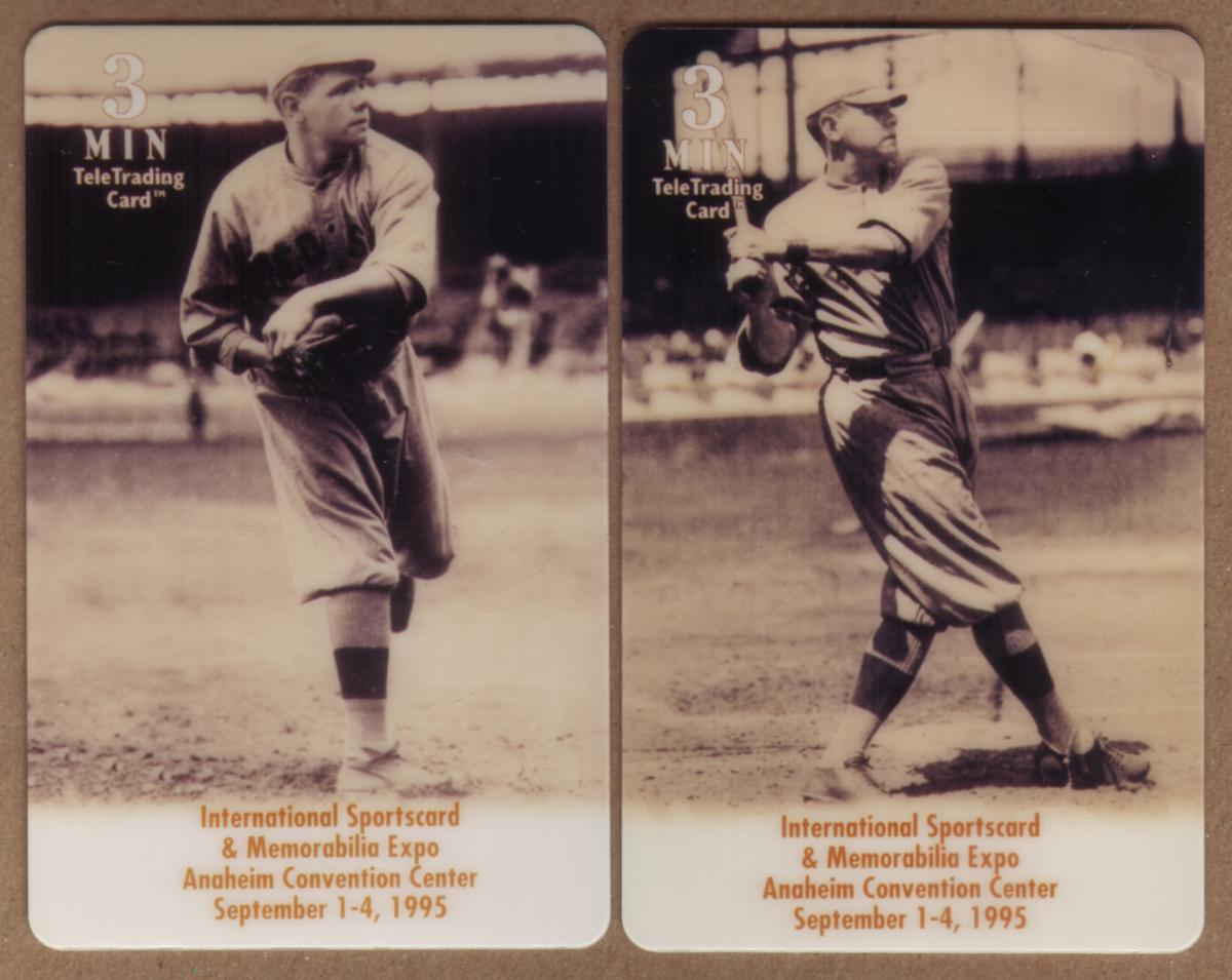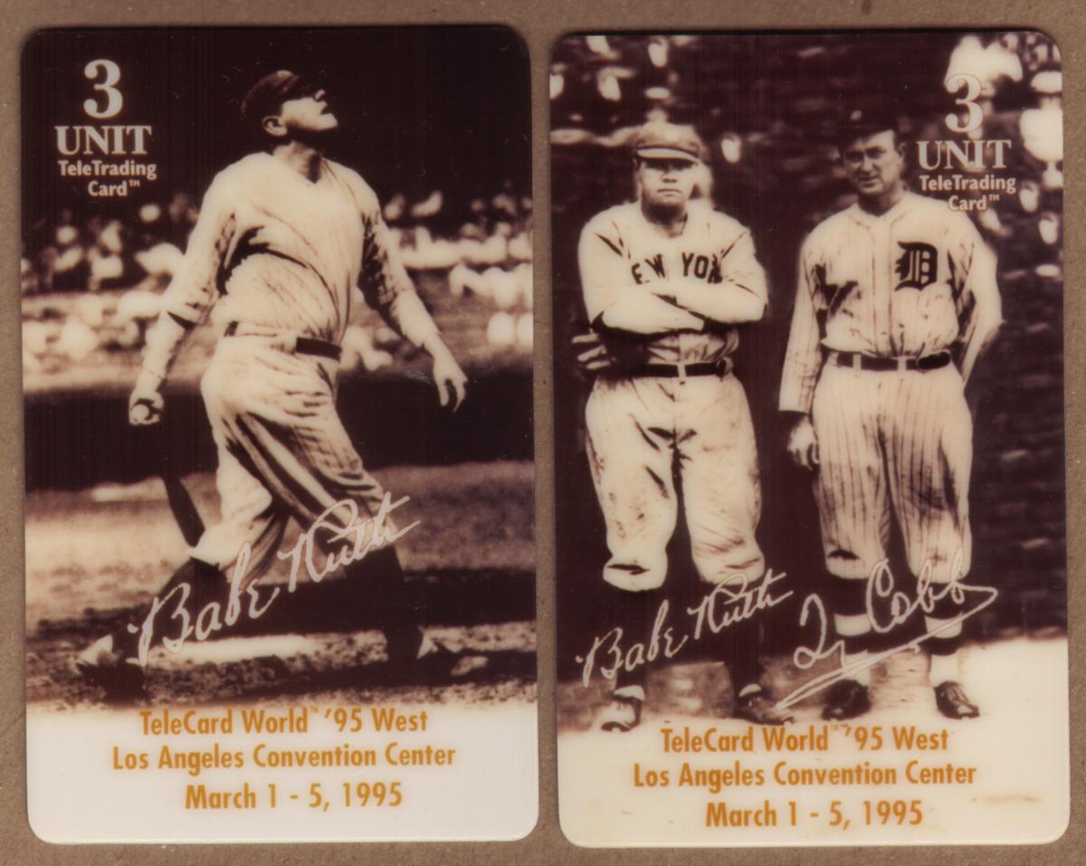 This set of 13 different collectible TeleTrading Cards from TeleTrading Cards Inc. celebrates legendary baseball players and significant sports trading card events from the mid-1990s. The cards feature sepia-toned historic photographs of iconic baseball figures including Babe Ruth, Lou Gehrig, and Ty Cobb, among others. Each card is denominated with either "3 UNITS," "3 UNIT," or "3 MIN" at the top left corner, marking their value or duration for telephone use.