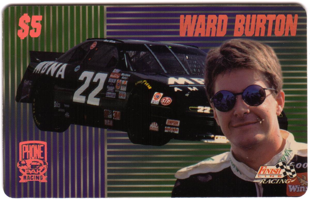 This collectible PhonePak phone card from 1996 features an auto racing theme focused on NASCAR. The card prominently displays the name Ward Burton, a well-known NASCAR driver, along with sponsorship logos including MBNA and STP. The design includes imagery of NASCAR race cars, reflecting the sport’s high-speed, competitive nature. The card highlights Finish Line Racing and the number 76, reinforcing its connection to professional auto racing.