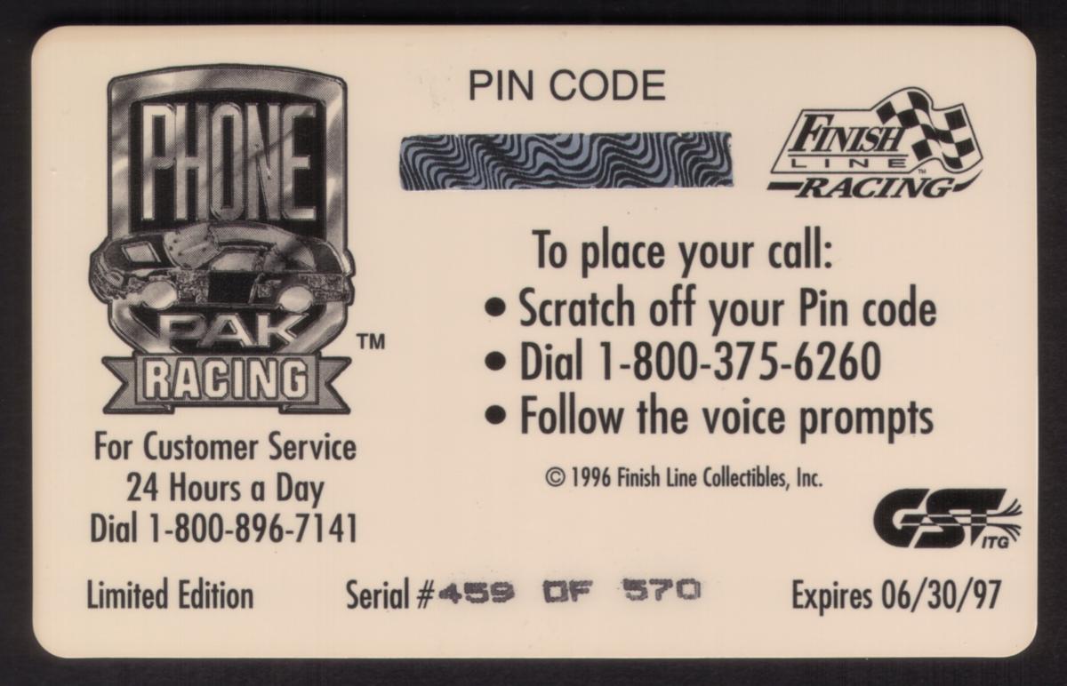 This card is part of a 1996 PhonePak series dedicated to auto racing and NASCAR, highlighting automotive and racing themes tied to Ford and the driver’s sponsorships. The design emphasizes the connection to competitive racing with Cope’s likeness, his car, and recognizable branding clearly presented.