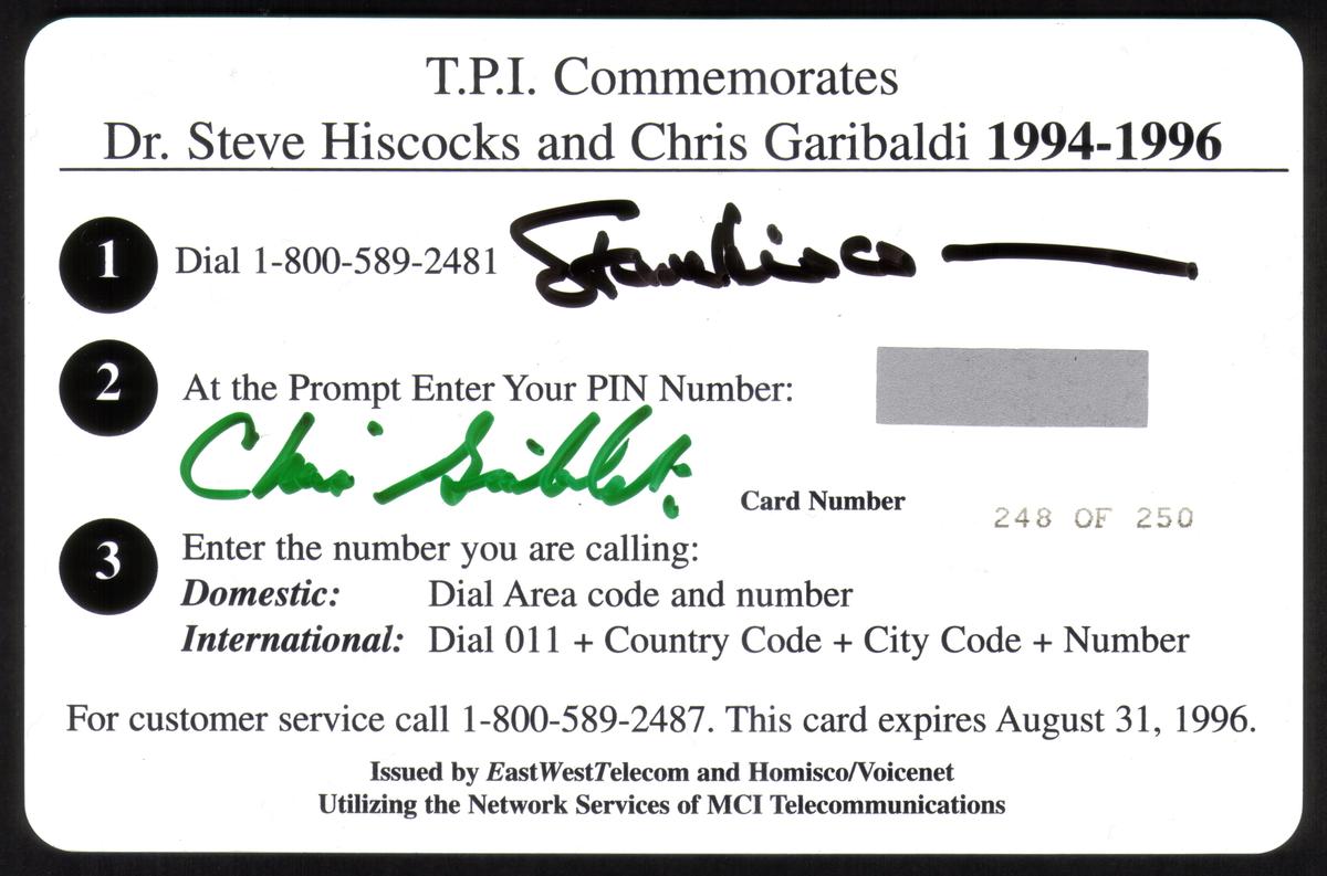 This telecard honors the significant contributions of Steven Hiscocks and C.M. Garibaldi to the phonecard collector industry through their detailed catalogs referenced by the H & G Standard Catalogs. The card design reflects a space theme that symbolizes the broad scope and exploration of telecommunication collectibles.