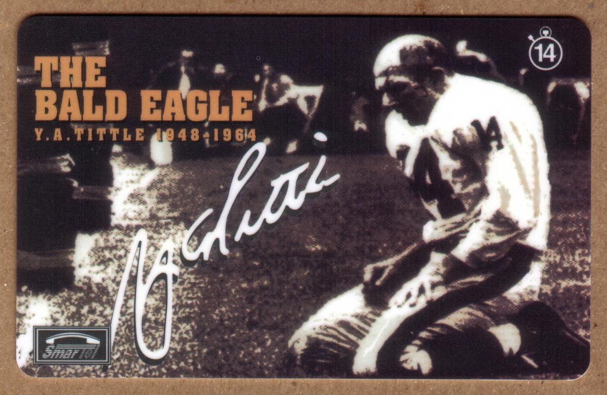 This collectible phone card features a black-and-white photo of Y.A. Tittle, a Hall of Fame National Football League player who played from 1948 to 1964. The image shows Tittle in a football uniform kneeling on the field, with the number 14 visible on his jersey sleeve. The card highlights his nickname "THE BALD EAGLE" and includes his signature in large, white script across the front.