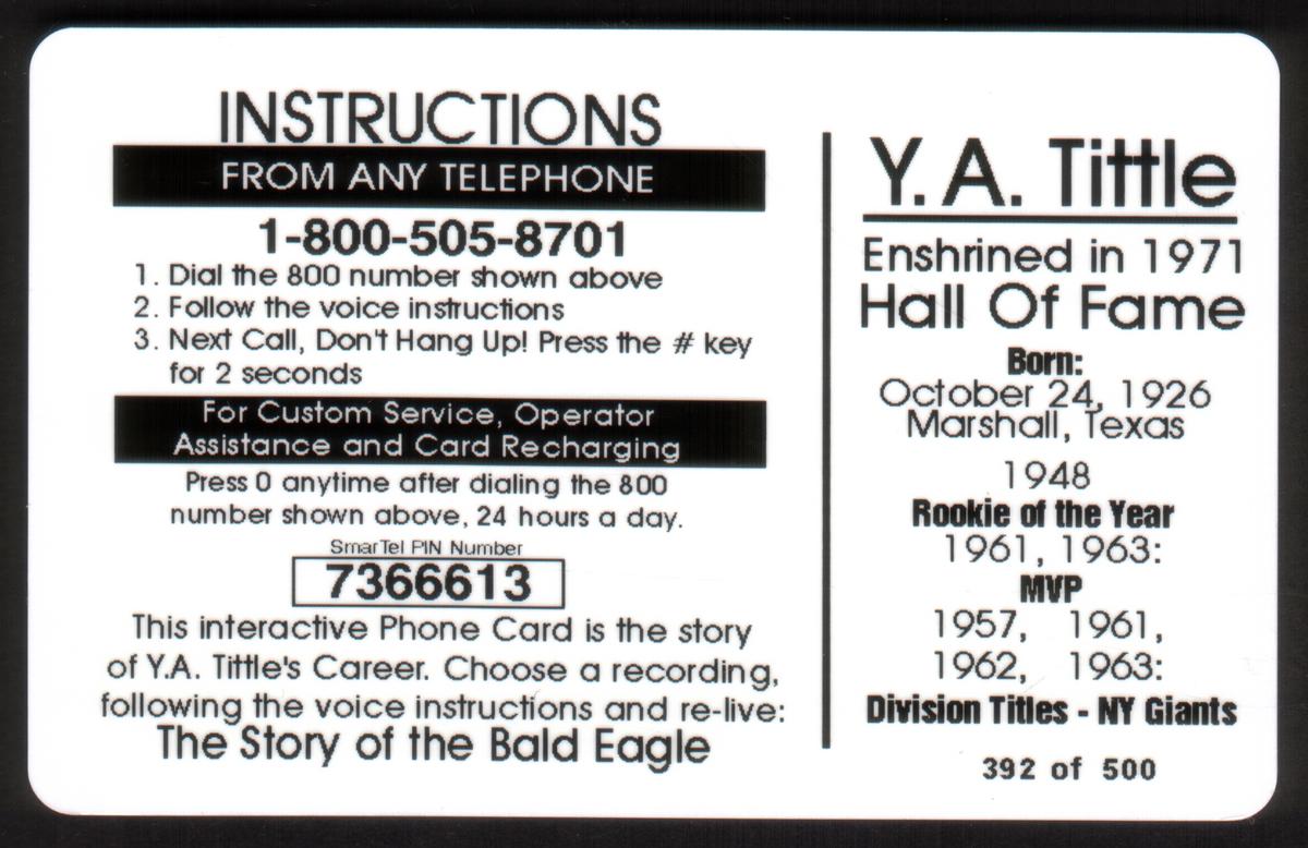 This phone card commemorates Y.A. Tittle’s career and connection to football, specifically the NFL, and celebrates his status as a 1971 Hall of Fame inductee and an MVP. It is an official collectible item related to the sport, focusing on one of football’s legendary players.