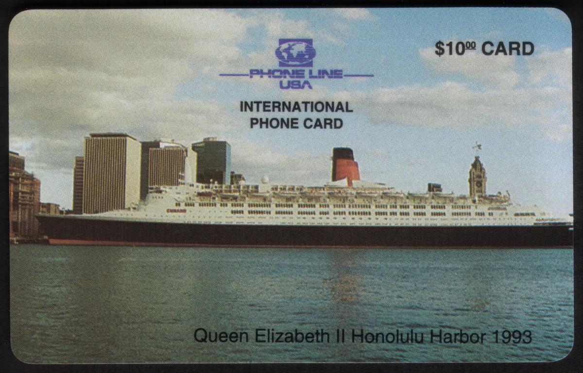 Overall, the phone card depicts a classic maritime scene from 1993, focusing on the Queen Elizabeth II cruise liner as it rests in Honolulu Harbor, Hawaii. The image reflects both the grandeur of the ship and the vibrant port environment.