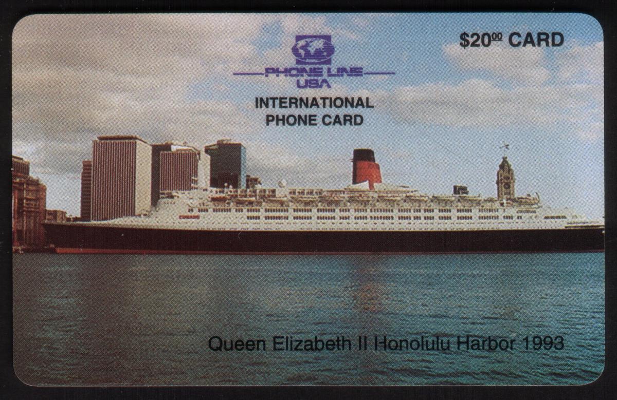 The card includes printed text indicating a $20 denomination and reads "Queen Elizabeth II Cruise Ship in Honolulu Hawaii Harbor 1993." The issuer name "Phone Line USA" is present on the card, confirming it as a collectible phone card related to telecommunications. Additionally, the card references themes of travel and sightseeing, highlighting Honolulu Harbor as a notable destination known as a "city on water."