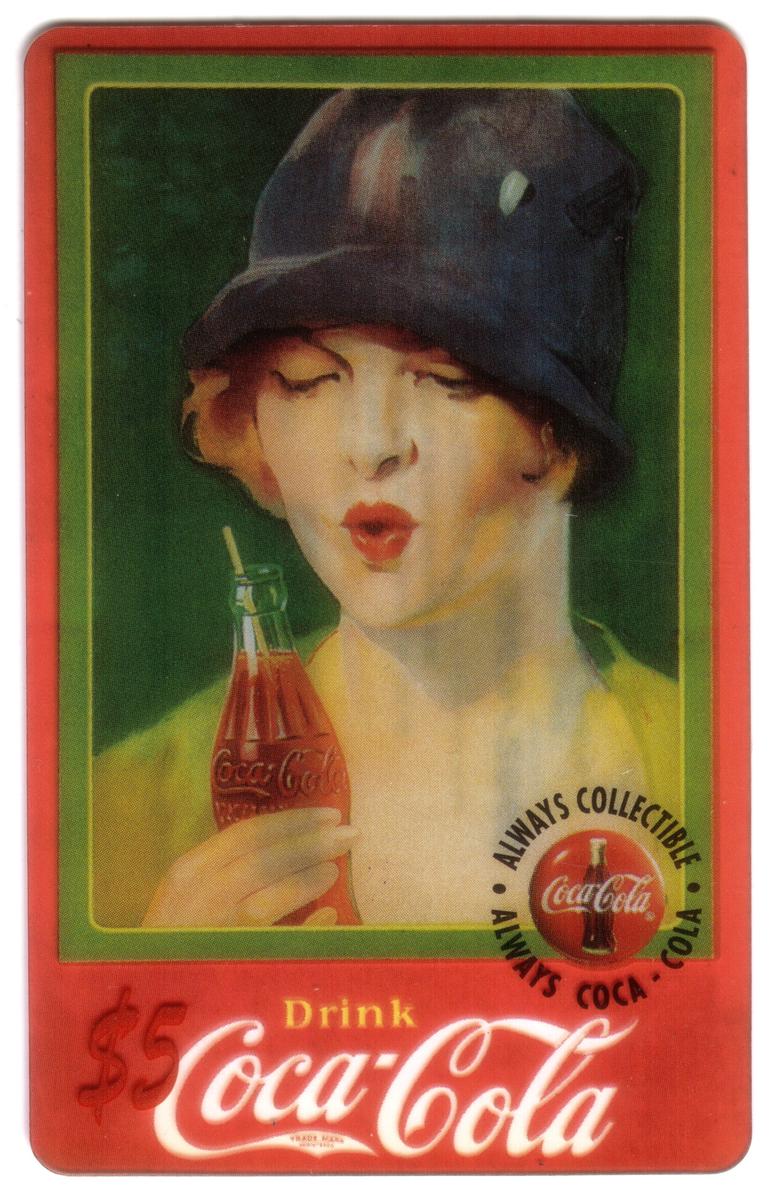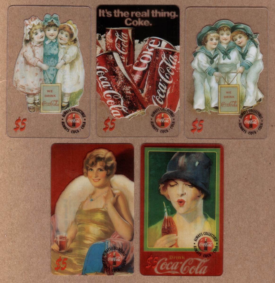 This set of five collectible Coca-Cola phone cards from 1995 features vintage and classic Coca-Cola imagery with a $5 value on each card. The designs showcase nostalgic and artistic representations tied to Coca-Cola's advertising heritage. Each card displays the official Coca-Cola circular logo with the words "ALWAYS COLLECTIBLE" around it.