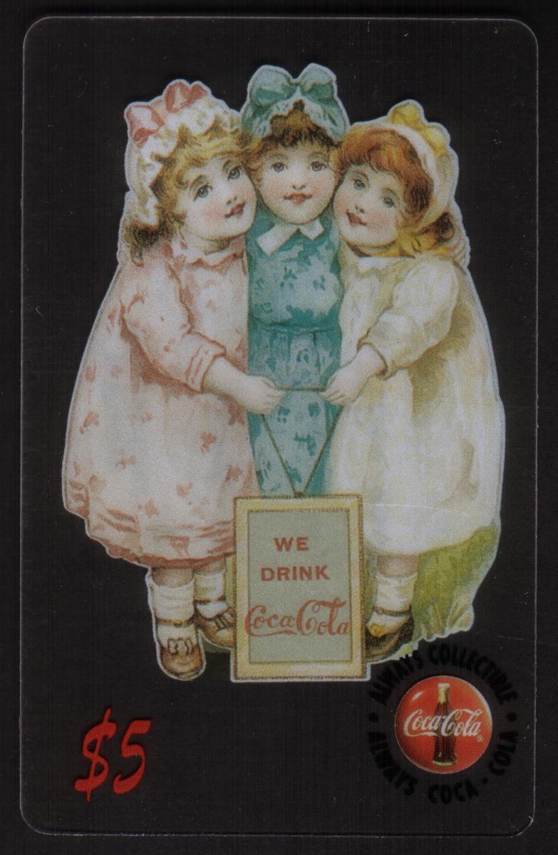 The first card depicts three young girls dressed in period-style dresses and bonnets, holding a sign that reads "WE DRINK Coca-Cola." The background is black, enhancing the pastel tones of the children’s clothing. The $5 value is printed in red in the lower left corner.