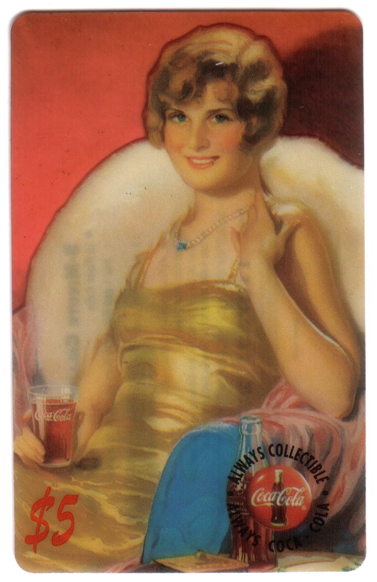 The fourth card presents a glamorous woman with short curly hair in a golden strapless dress with a white fur stole, seated and holding a glass of Coca-Cola. The backdrop is a warm red tone, and the Coca-Cola circular logo mark is printed on the lower right corner next to the $5 denomination in red.