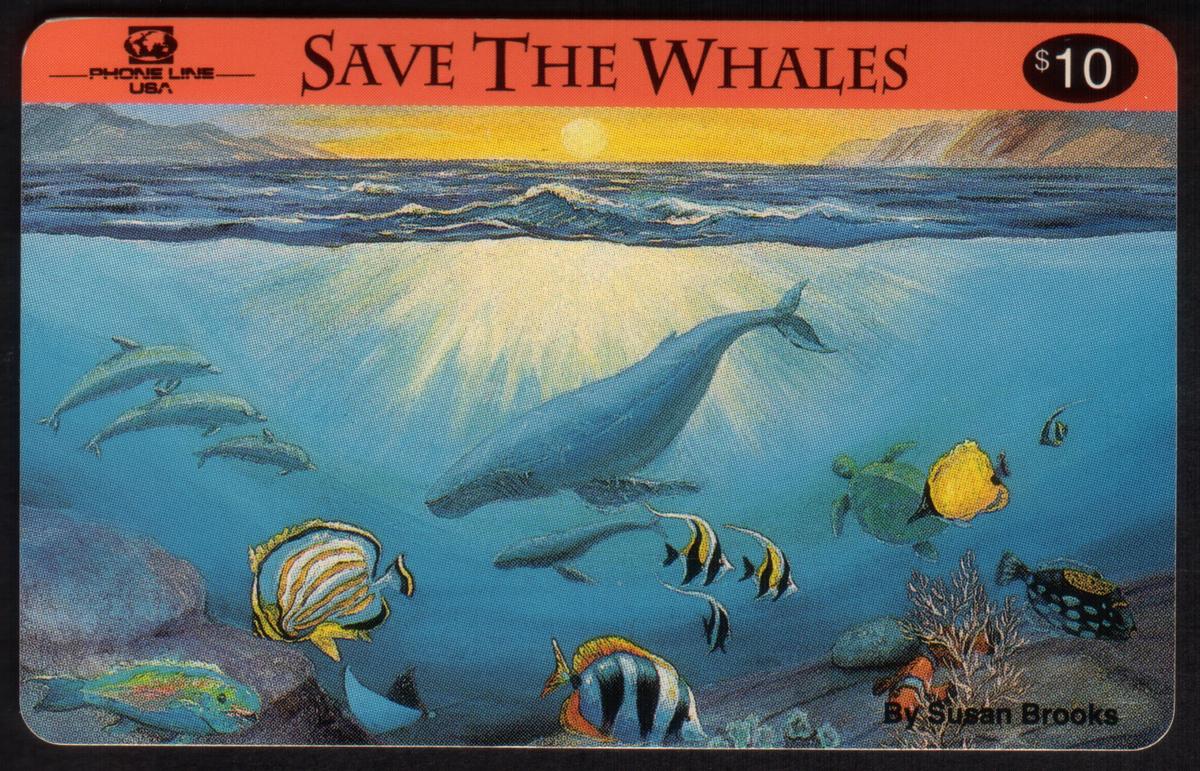 This collectible phone card highlights marine life conservation through artistic representation by Susan Brooks. It displays key marine animals — whales, dolphins, turtles, and tropical fish — in an underwater habitat with coral and dynamic lighting effects created by the sun’s rays penetrating the water.
